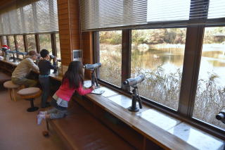 林の中を巡る園路のほか、舟田池の畔には「野鳥観察舎」が整備されています。野鳥観察舎では望遠鏡や図鑑が無料で自由に使え、空調も完備しているので、季節を問わず安全かつ快適に野鳥を観察いただけます。生態園には博物館の研究員が常駐し、園内の最新情報を発信しています。