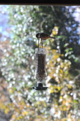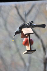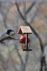 ヒヨドリはくだもの用のエサ台の屋根に止まった後、ホバリングをして食べようと試みました。最終的には、