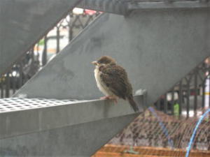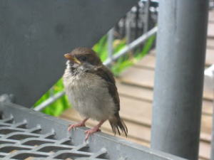 1羽でいるスズメの巣立ちビナ。まだ幼く、心配になってしまいますが、