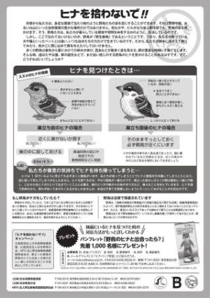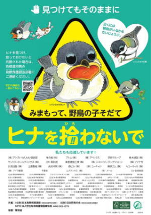 このキャンペーンは、一般の方々が地面に落ちた野鳥のヒナに出会った場合の対応を認知していただくためのもので、環境省後援のもと、(公財)日本鳥類保護連盟、(公財)日本野鳥の会、NPO法人 野生動物救護獣医師協会が中心となりご協賛を呼びかけ、企業、団体、行政などからいただいた協賛金をキャンペーンポスターの制作費に充当し、これを各地方自治体、学校、会員の皆様などに広く配布して普及啓発活動を行っているもので、26年継続して実施しております。これまで多くの方々のご支援ご協力により、巣立ちビナへの対応の仕方についての認識が一般の方々にも少しずつ浸透してきていると思われますが、ヒナが巣立つ時期になりますと、未だに「ヒナを拾ってしまったけど、どうしたらいいの?」というお問合せが多くの方々から寄せられている状況下にありますので、引き続きこのキャンペーンを実施することにしました。