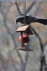 ヒヨドリはくだもの用のエサ台の屋根に止まった後、ホバリングをして食べようと試みました。最終的には、