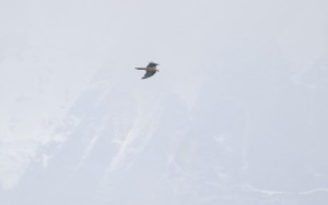 ヒマラヤ山脈をバックに飛ぶヒゲワシ