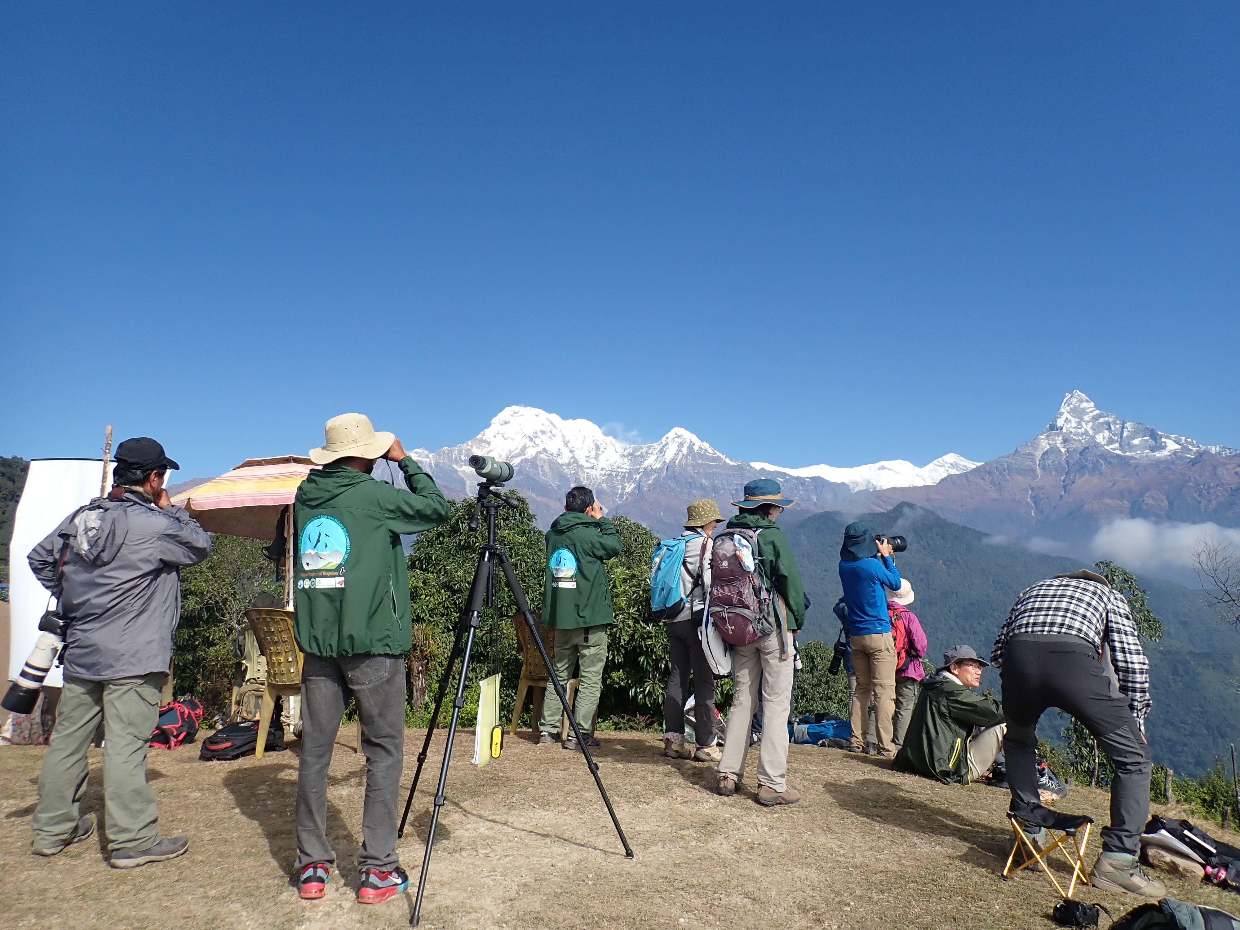 2回目はエコツアー実践の時期である11月に訪問し、調査技術の提供、エコツアーガイドの実践、ACを利用する登山客へのアンケート調査を実施しました。その中でエコツアーガイドの実践については、試験的なエコツアーを実施しました。5名のエコツアー参加者に対して、9月に選定したコースでの早朝バードウォッチングや猛禽類の渡りについてのガイドの引率を、ネパール鳥学会会員に行ってもらいました。猛禽類を観察する丘ではたくさんの大型猛禽類が眼前を渡っていく姿に圧倒されましたが、中でもヒマラヤをバックに飛翔するヒゲワシにはエコツアー参加者はもちろん、私たちも皆心を奪われました。猛禽類だけではなく小鳥類も多く観察することができ、ACだけでも68種類を観察し、改めて生態系の豊かさを感じることができました。さらにACを利用する登山客31名にリーフレット、ステッカーの配布およびアンケートを行い、普及啓発と登山客のニーズや現状について把握することができました。