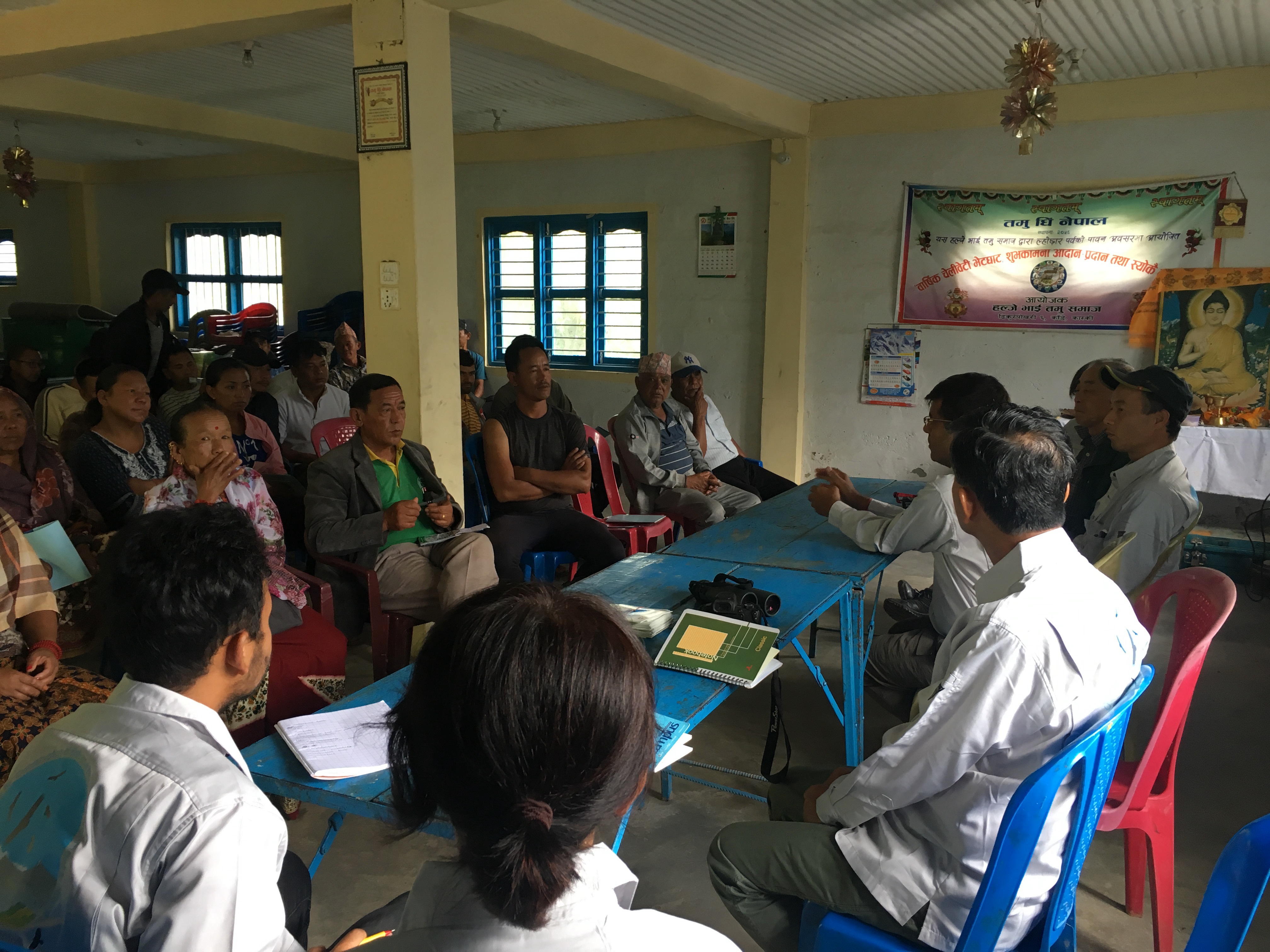また地域に根差した活動にするため、ACの麓にあるカンデ村住民等に対して説明会を実施し、参加していただいた46名の方々に本プロジェクトへの理解を深めていただきました。参加者は予想以上に関心を持ちたくさんの意見を出してくださり、説明会後のアンケートにも快く協力していただきました。