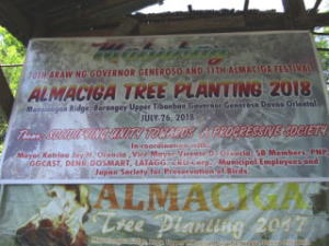 7月25日の夜、私たちはチバンバンの植樹祭が行われる場所に出向き、前夜祭に参加しました。ここは採石のために森林が伐採された場所ですが、その際、地元の資源となっていたアルマシガの木が、丈夫で坑道の支えに適しているということで重点的に伐採されてしまいました。アルマシガの樹液は燃料として地元の生活を支えるだけでなく、収入源にもなるため、地元の人たちにとって重要な資源です。その資源を取り戻し、将来的に生計を立てられるようにするため、そしてフィリピンワシをはじめとした様々な生き物のために森林再生が行われています。私たちはアカハラダカなどの渡りを行う猛禽類の保全に役立てるため、この活動に参画し、今回経団連からの助成を寄付することとなりました。