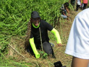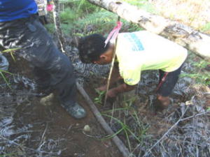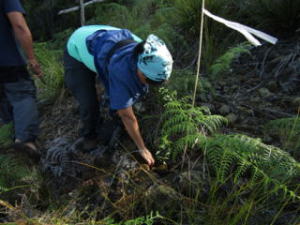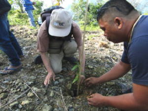 次の日の朝、いよいよ植樹祭が始まります。横断幕には連盟の名前も加わっていました。植樹の安全を祈願した儀式を行った後、朝食を済ませていざ、植樹の開始です。植樹の方法について説明を受けた後、皆がそれぞれ苗を手に一斉に山の中に入ります。メインとなるアルマシガの苗はこの場所で種を拾って育てたものです。森林再生のために必要な場所には、すでに白い目印が付いた棒が立っており、その根元を掘って植樹します。苗を植えた後は、直射日光を避けるためにシダ植物を脇に差し、日よけ代わりにしました。こうして暑さが厳しくなる前に第一陣が終了。この日だけで1,000本近く植えるそうですが、私たちも少しはお役に立てたのでしょうか。百数十名いるボランティアメンバーが一人当たりの年間ノルマ100本を目指して植樹を続けるそうです。皆さんの健闘をお祈りします。