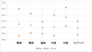 国内で比較すると大阪府と沖縄県では同程度で福岡県は軽い傾向にあります。関東はエリアはサンプル数が多い為か最大値と最小値の差が大きくなっています。また、海外では相対的に中国が重たく、リトアニアでは軽い傾向が見られました。
