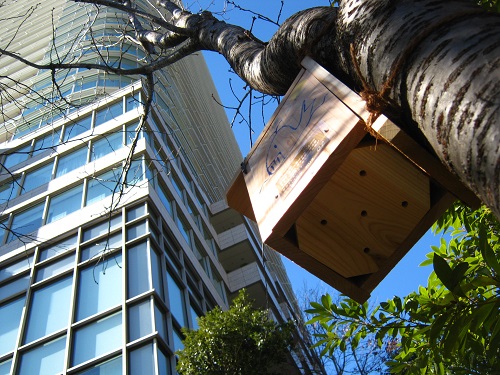 六本木のビルの中にあるまちの保育園には広い庭園はありませんが、周辺の緑地環境を利用した巣箱プログラム(巣箱作り・架け教室/巣箱調べ教室)を行い、連盟のオリジナル巣箱は園児たちでもトンカチを使って、作れるため、最後には色々な絵が描かれたかわいい巣箱が完成します。園児たちは日頃の登園や散歩中に巣箱を観察し、スズメやシジュウカラの営巣を見守っています。大都会の真ん中にあるにもかかわらず、身近な野鳥が繁殖できる環境が整っていることが分かっています。