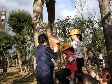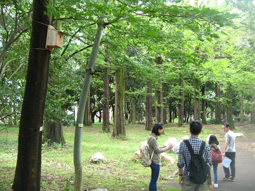 所沢航空記念公園、所沢航空発祥記念館と共催で、一般の親子を対象とした巣箱プログラム(巣箱作り・架け教室/巣箱調べ教室)や野鳥に関する工作などを行うプログラムの指導を行っています。巣箱は公園内の木々に架け、主にシジュウカラが営巣するほか、年によってアオゲラが巣箱の穴を大きくしていくこともあります。