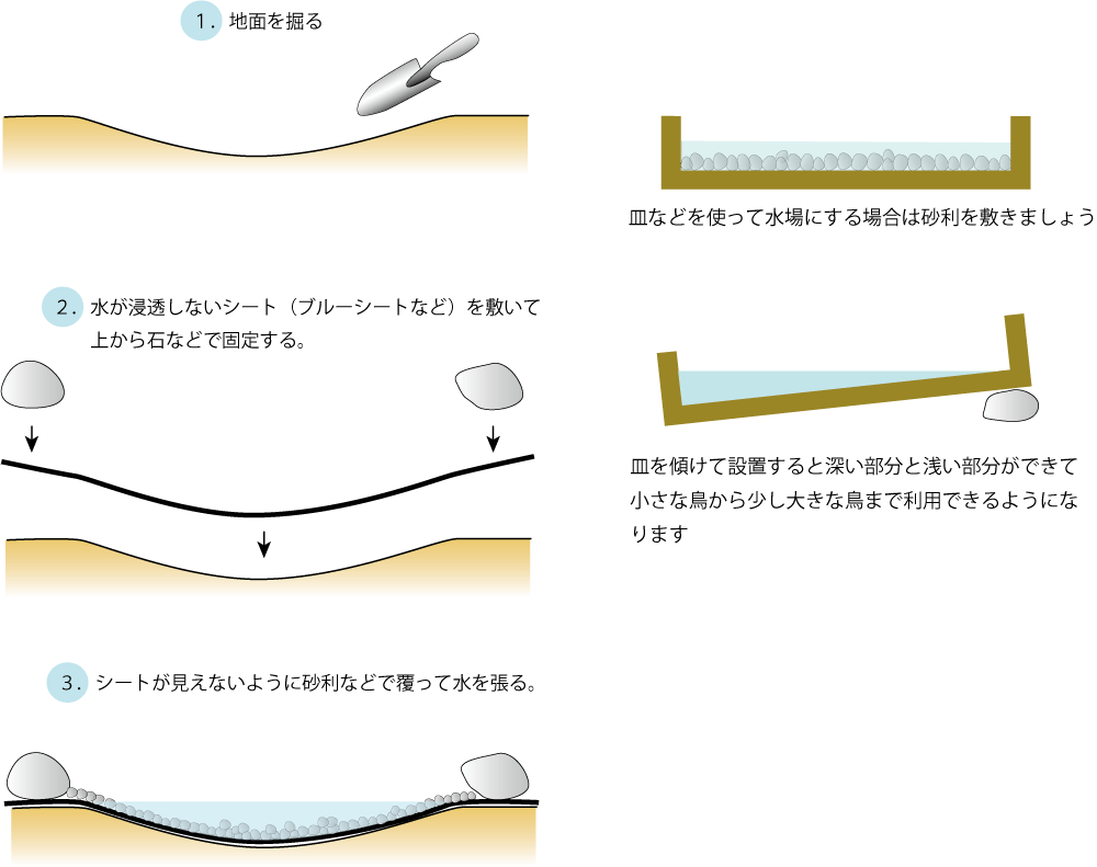 水場は野鳥にとって、水分を摂るためにも羽を清潔に保つためにも大切です。また、水場は身近な生きものの住処となります。池のようなものがあれば理想的ですが、バードバスや家庭にあるお皿などを利用することもできます。水場は通年利用できます。水が汚れたら器などを洗って水を替えるようにしましょう。また、夏は蚊が発生するので、こまめに水を入れ替えることをお勧めします。