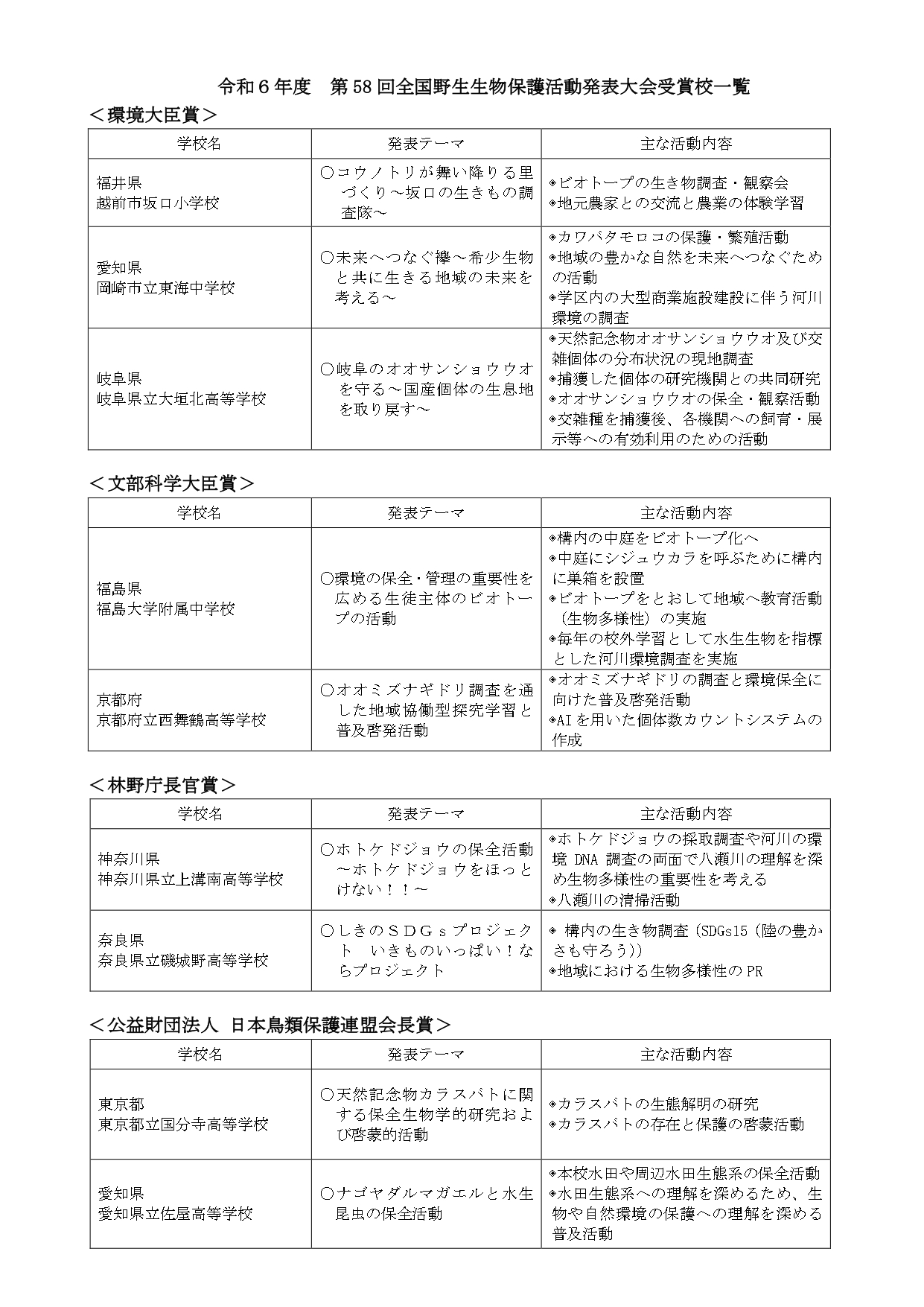 第58回全国野生生物保護活動発表大会全応募校の活動の内容は、以下のページでご紹介しています。ぜひご覧ください。