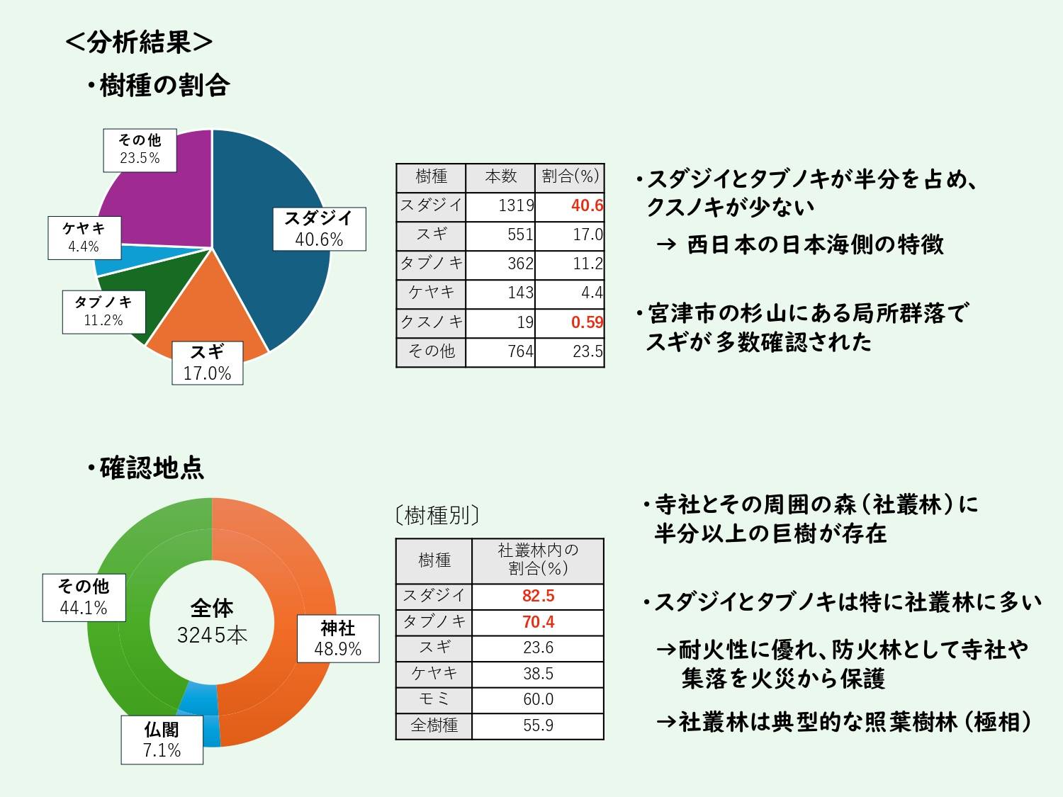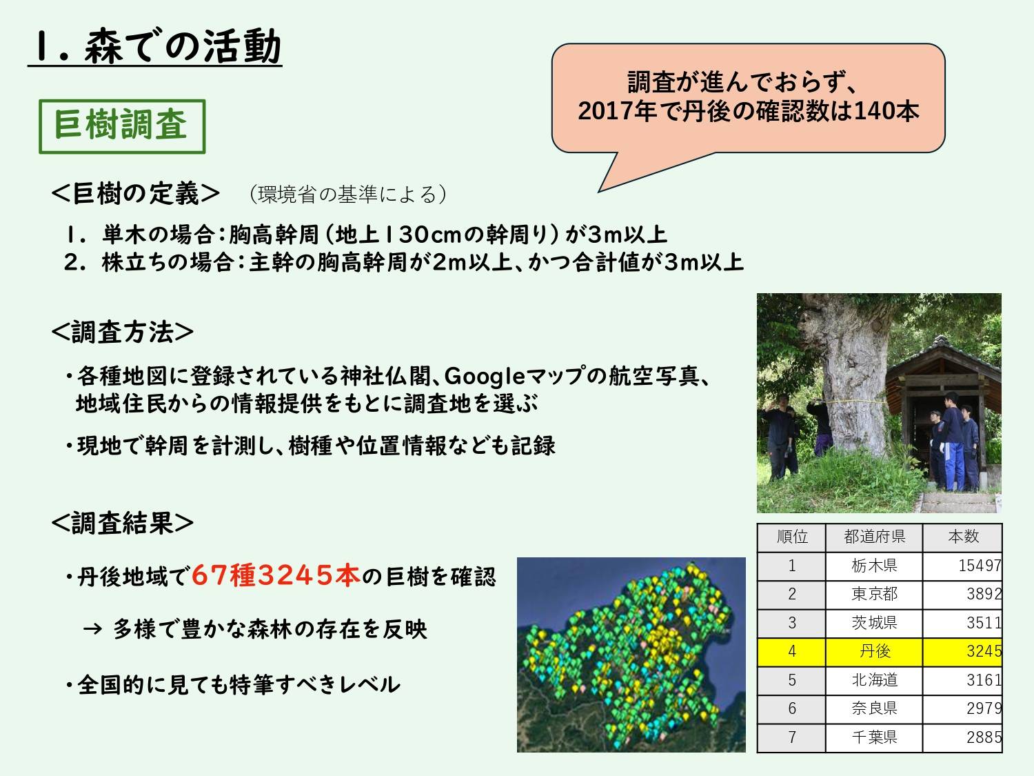 自然環境を保護するため、はじめにその地域の現状を把握する必要があります。しかし、丹後地域の巨樹に関する十分なデータはありませんでした。私たちの調査・分析の結果は自然環境を客観的に評価する材料に、それをまとめた書籍は多様で豊かな森林の存在を地域の人に知ってもらうきっかけになり、森林資源の保護につながります。また、巨樹を調査しながら自然・歴史の特徴や人との関わりを読み解き、私たちが丹後についての知識を深め魅力を発見します。それを地域内外に発信することで、地域活性化に貢献できるはずです。