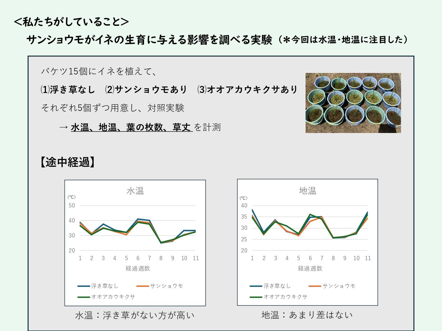 一方で、サンショウモは多くの農家から水田雑草として取り除かれる存在です。なぜならサンショウモが水田を覆うことで日光を遮り十分に水温が上がらず、加えてイネの生育に必要な栄養を奪い取ってしまうため、イネが育ちにくいと考えられているからです。本当にそうなのでしょうか?私たちはこの疑問を解決するために実験を始めました。バケツでイネを育て、サンショウモの有無によって水温や地温にどれくらいの差があり、それがどのようにイネの成長に影響するのか計測しました。実験はまだ終わっていませんが、今のところイネの成長にあまり差はありません。稲刈り後、収量を比較する予定です。今後は、サンショウモの栄養塩類の吸収力を調べる実験を計画しています。他にも「サンショウモが水面を覆っていた方が雑草が生えにくいのではないか」という仮説のもと、実験を行いたいと思っています。