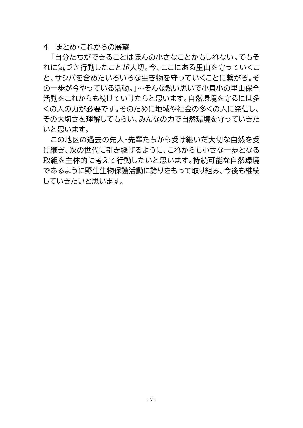 5年生の総合的な学習活動を中心として、野鳥そのものの保護から野鳥が生息できる里山を守る取り組みとなるよう県の生物多様性アドバイザーの支援・指導を受けて教育的な視点より活動をしています。