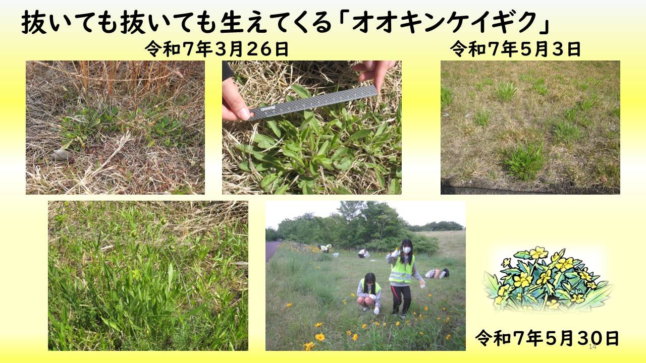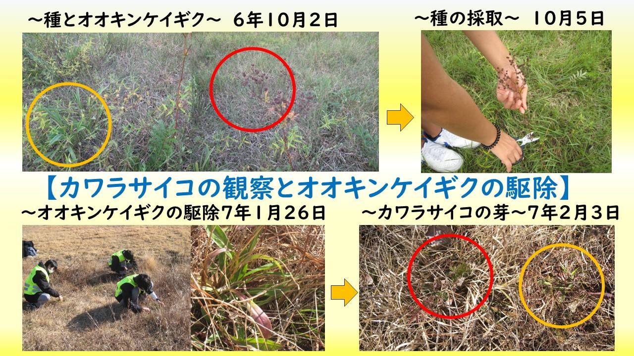 私たちは、カワラサイコの生育地の保全活動として、令和6年5月以降、月に1回は南派川の河川敷へ行き、カワラサイコの観察とオオキンケイギクの駆除活動を継続している。