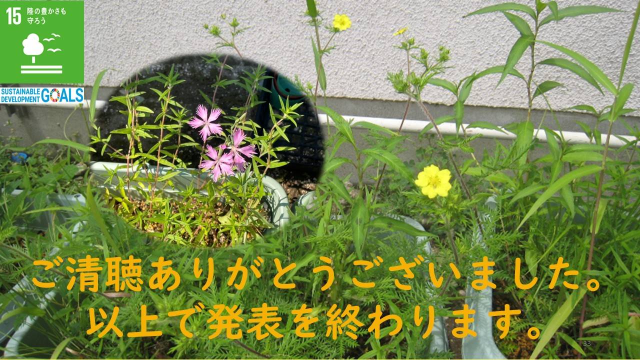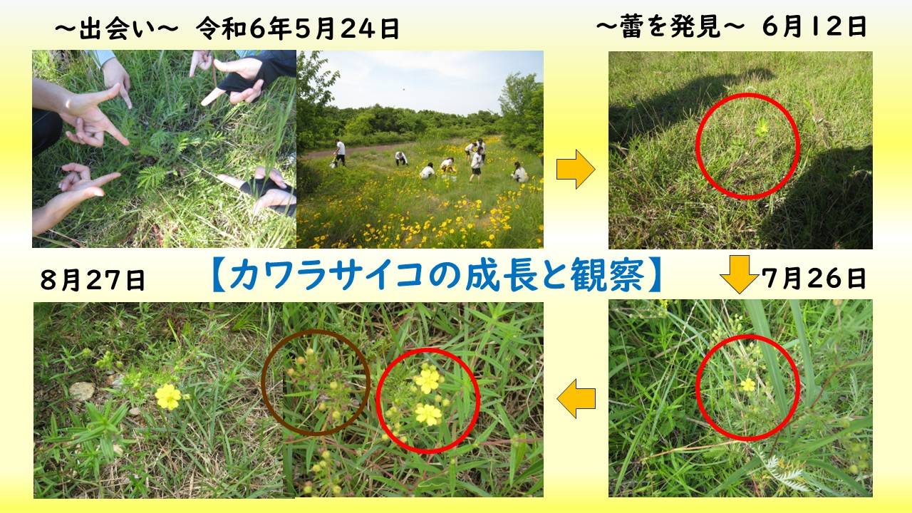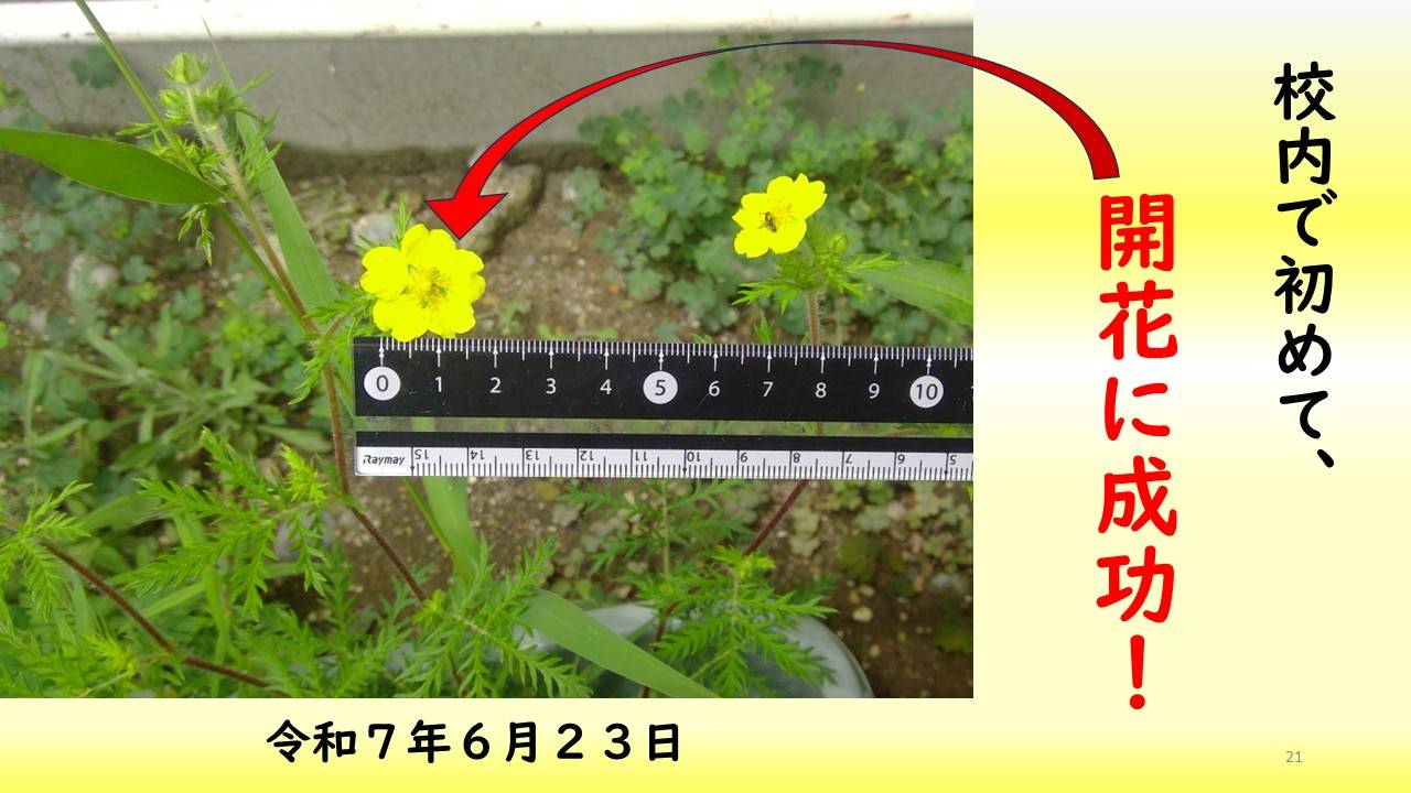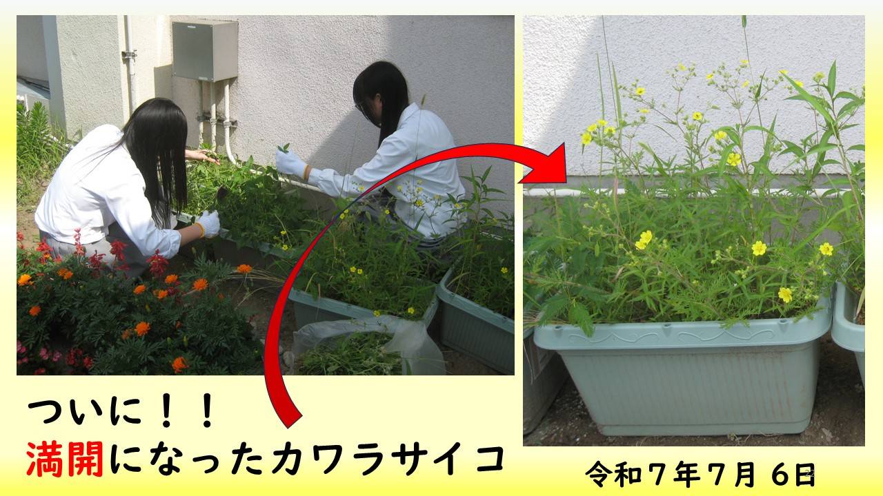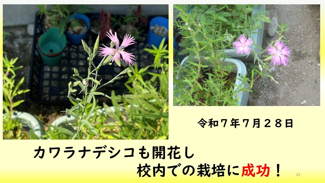 カワラサイコの生育地域外の保全活動としては、令和7年2月に育苗ポットに種を蒔き、4月に木質化したカワラサイコの根を採取し、プランターに移植した。6月23日には、生育地域外である学校内のプランターで初めてカワラサイコの花を咲かせることが出来た。また、4月に蒔いたカワラナデシコも7月28日に初めて花が咲いた。カワラサイコやカワラナデシコの生育地域外での栽培が可能であることから、これらを校内の花壇に移植し、カワラ姉妹の楽園づくりの足掛かりとしたい。
