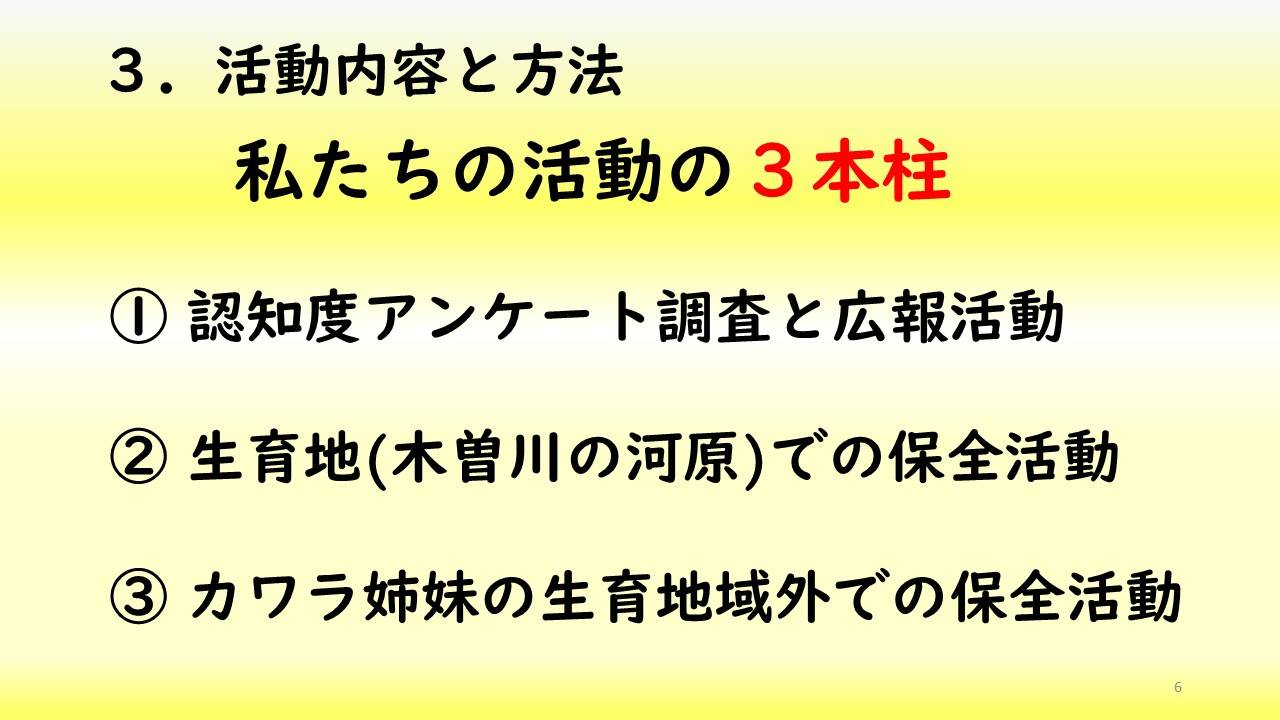カワラサイコの保護とオオキンケイギクの駆除の必要性を訴える広報活動においては、7月24日と30日に株式会社東海理化と連携し、大口北小学校で大口北児童クラブの子供たちに向けて、環境学習プログラムを実施した。身近な外来生物のクイズを出題し、生命力の強いオオキンケイギクやミシシッピアカミミガメ等の外来生物が在来生物を絶滅の危機に追いやっていることを紹介した。また、特定外来生物であるオオキンケイギクの花びらを使い、缶バッチやしおり作りを行い、子供たちに外来生物の駆除の必要性と在来生物の保護の必要性を理解してもらえた。