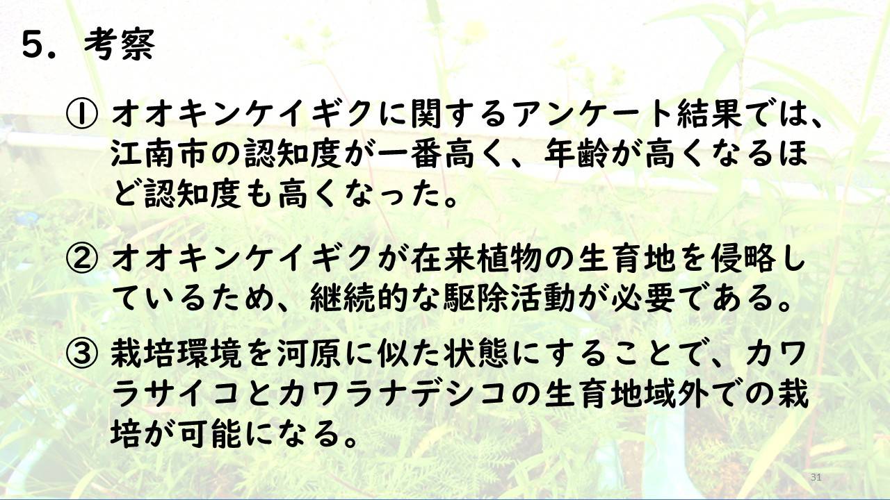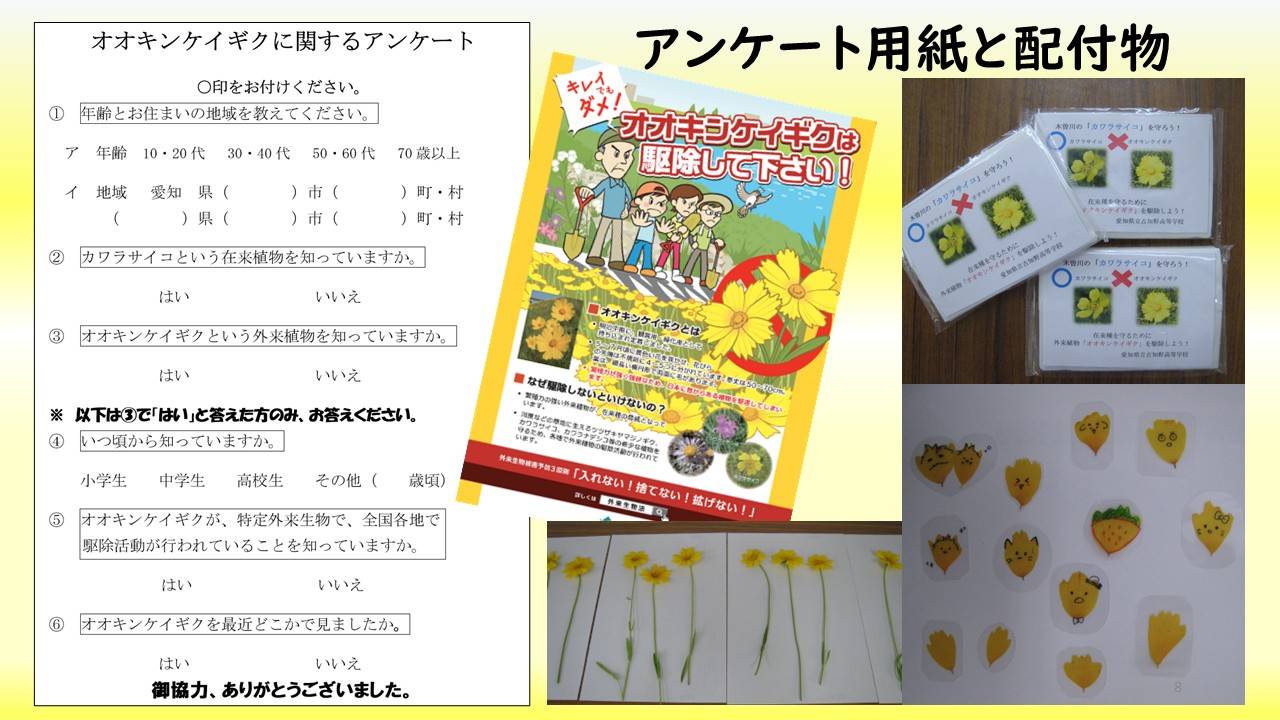 ・地域との連携を図ることを心掛け、江南市や名古屋市からご支援をいただき、地域での広報活動とアンケート調査に力を入れた。また、地元の企業(イオンモール株式会社、リンナイ株式会社、株式会社東海理化、エスペックミック株式会社等)との連携を図り、私たちの活動の発表の場を提供していただいたり、オオキンケイギクの駆除活動や在来植物の保護活動を一緒におこなっていただいたりした。学習会も開催していただき、環境活動、特に陸の豊かさを守ることの重要性を私たちは学び、市民や子供たちに伝えることができた。