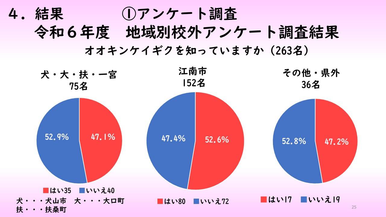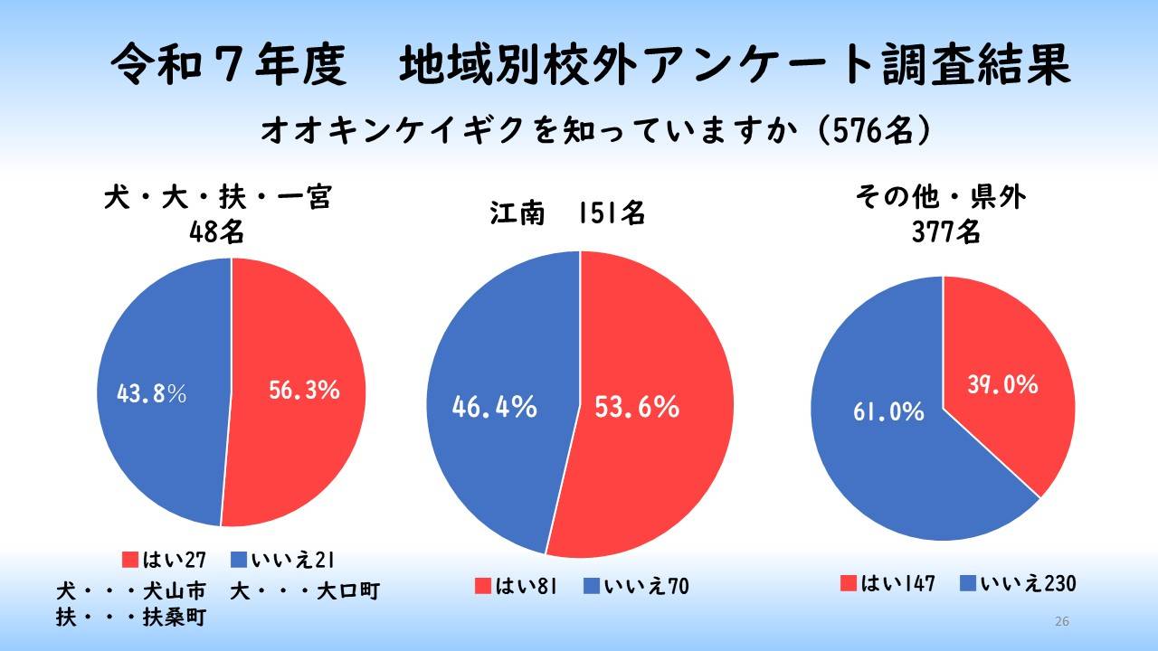 昨年度の地域別アンケート調査ではオオキンケイギクの認知度は江南市のみが50%を超えていたが、今年度は、江南市に加え、犬山市・大口町・扶桑町・一宮市の認知度も50%を超えていた。また、年代別アンケート調査では昨年同様、70歳以上の認知度が一番高く、年齢が下がるにつれ認知度も低くなっていた。アンケート調査と同時に行う広報活動により、若い世代にもカワラサイコの保護とオオキンケイギクの駆除の必要性を知ってもらうことができた。また、児童クラブの子供たちやイオンモールでの缶バッチやしおりの作成等のイベントにより、子供たちの認知度を高めるための広報活動を行おことができる。