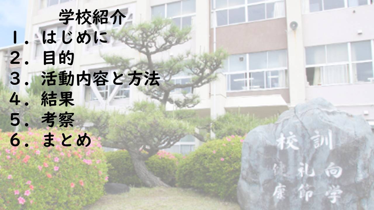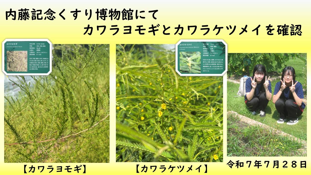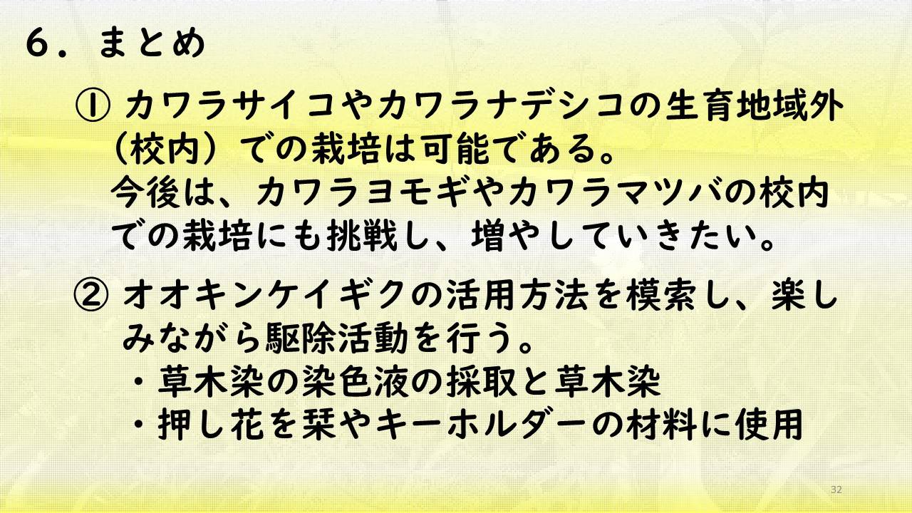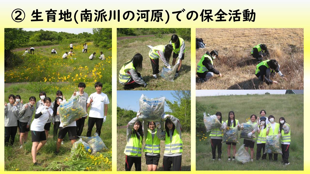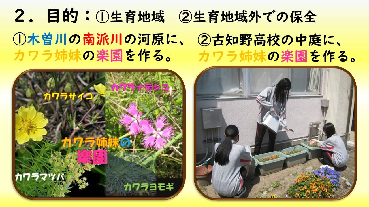 ・私たちは、カワラサイコやカワラナデシコ、カワラマツバ、カワラヨモギを南派川の河川敷で確認した。これらの在来植物の校内での栽培に挑戦し、校内の花壇に「カワラ姉妹の楽園」を作りたい。
