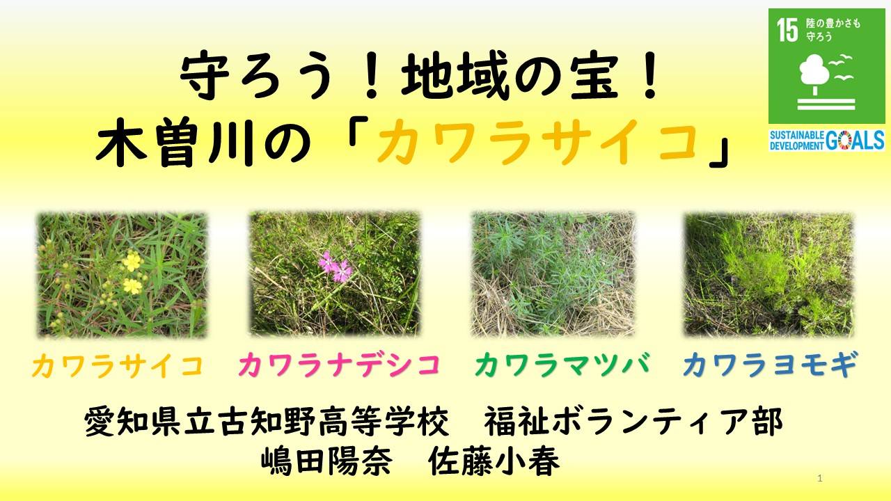 かつては木曽川の河原に多く生育していたカワラサイコ。愛知県では絶滅危惧Ⅱ類に指定され、2015年の国土交通省の調査までは確認されていました。私たちは、愛知県で確認できなくなったカワラサイコを2024年5月に江南市を流れる木曽川の南派川の河原で発見し、生育地と生育地域外(学校内)での保全活動と地域での認知度を高めるための広報活動を始めた。