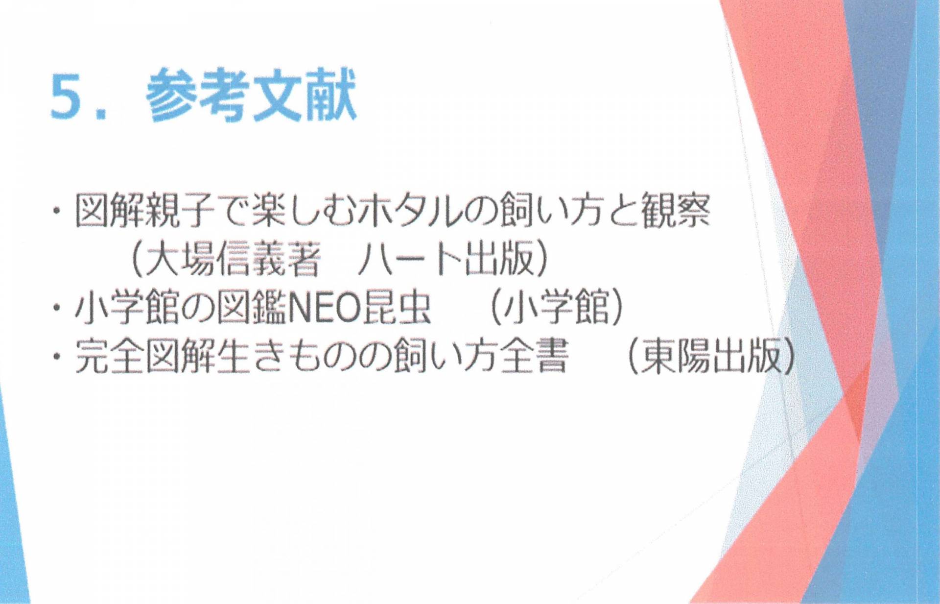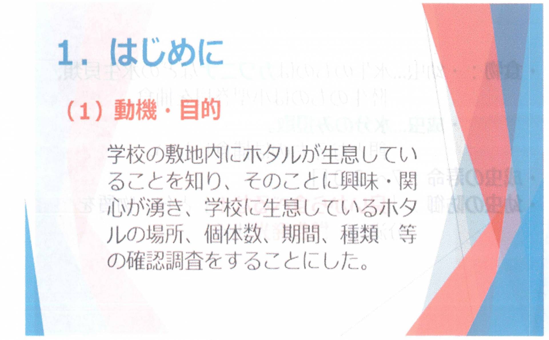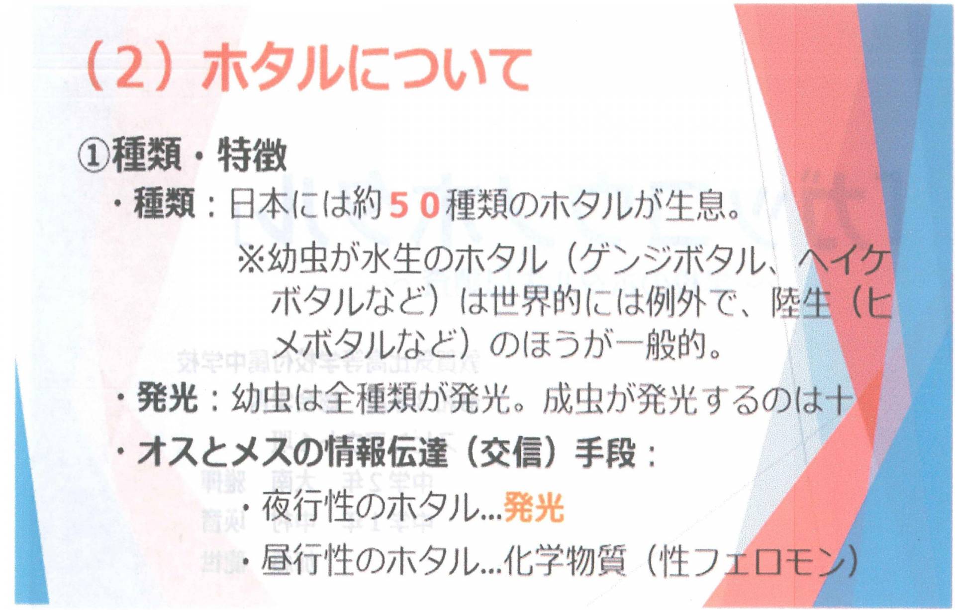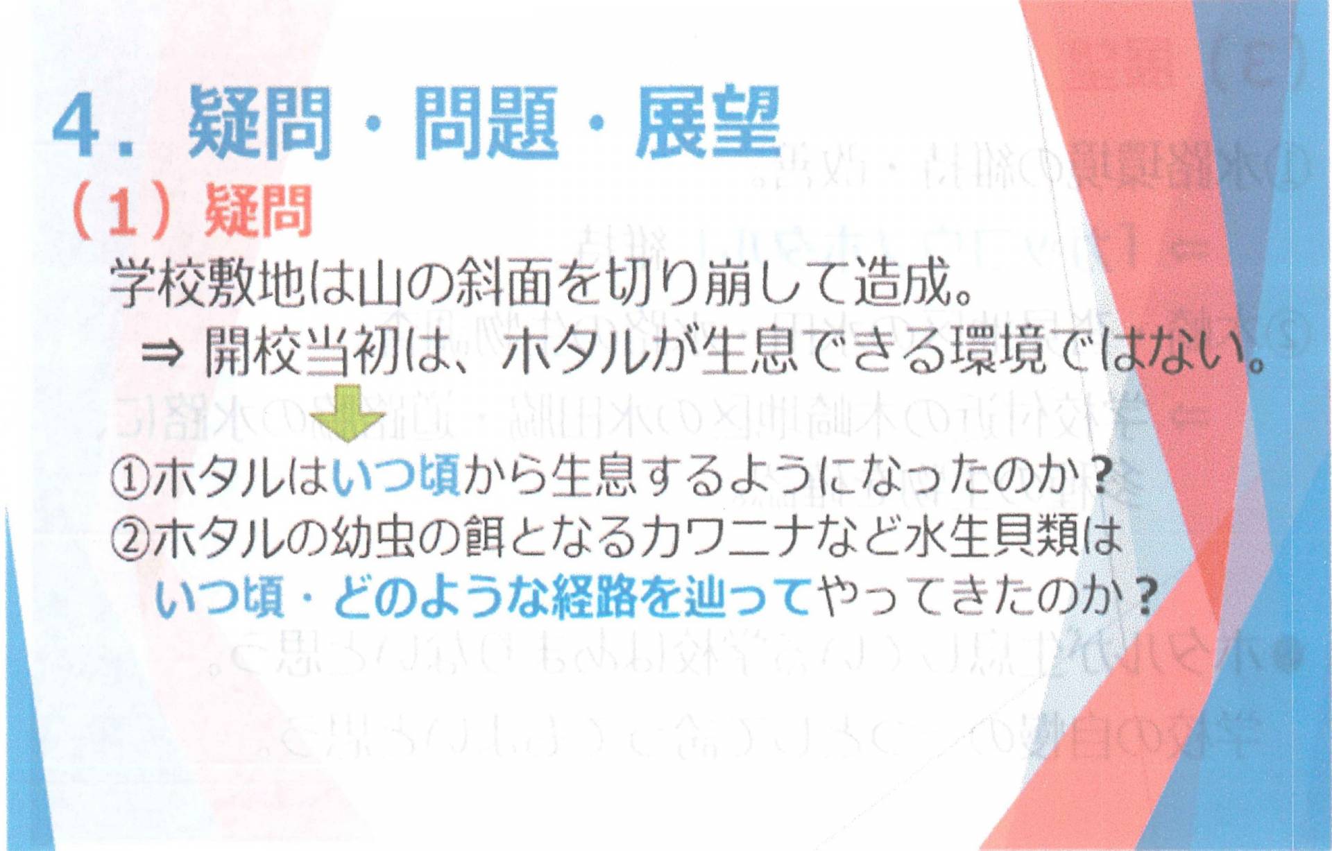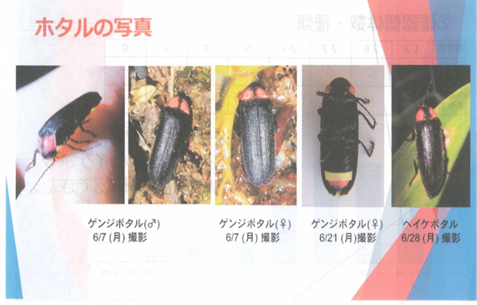 がる可能性がある。それまでの措置として、学校のホタルを維持し、数を増やしたい。元々ガッコウのホタルは周囲の水田や川から飛来し、定着したものと考えられるので、今度は学校から地域へと広げ、戻し、還元?恩返し?できればよいなと考えている。
