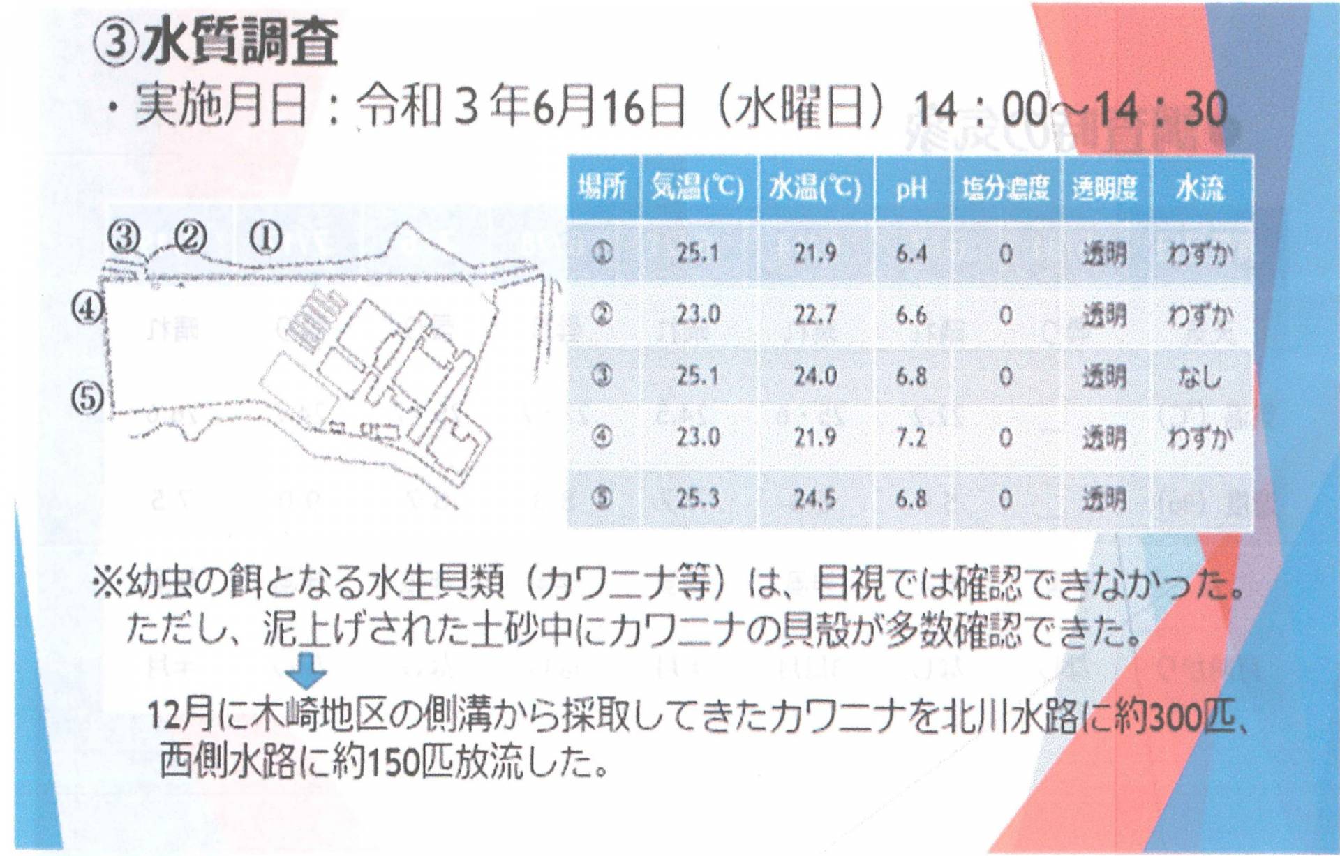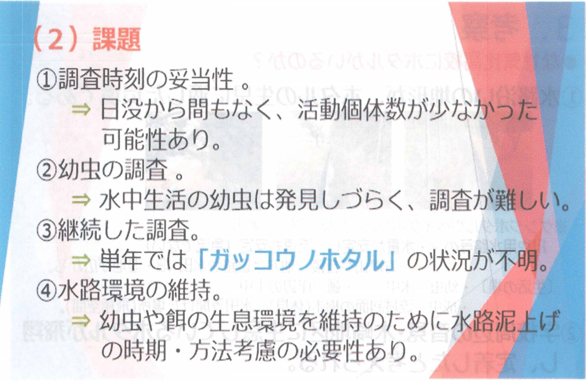 ・今後も水路環境の維持・向上により、生息数の増加を図りたい。ただ、急激で大きな環境整備はマイナスに作用する危険性も考えられるので、様子を見ながら、時間をかけて少しずつ進めたい。