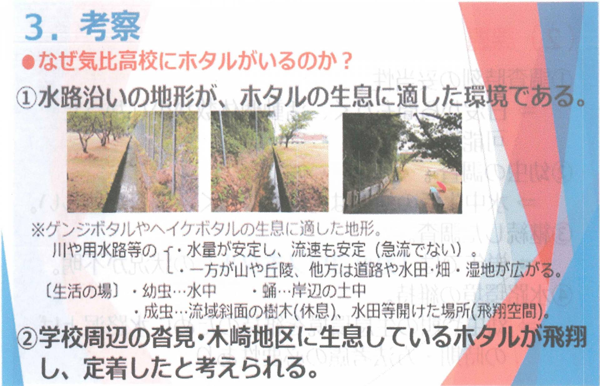 学校の敷地は約40年前、山際の余面を切り崩して造成されたものであり、開校当初はホタルが生息できる環境ではなかったが、水田が東から南、そして西の周囲に広がっており、そこから飛来したものが定着し、細々と繁殖したものと考えられる。(←15~20年ほど前?いつ定着したかは不明)