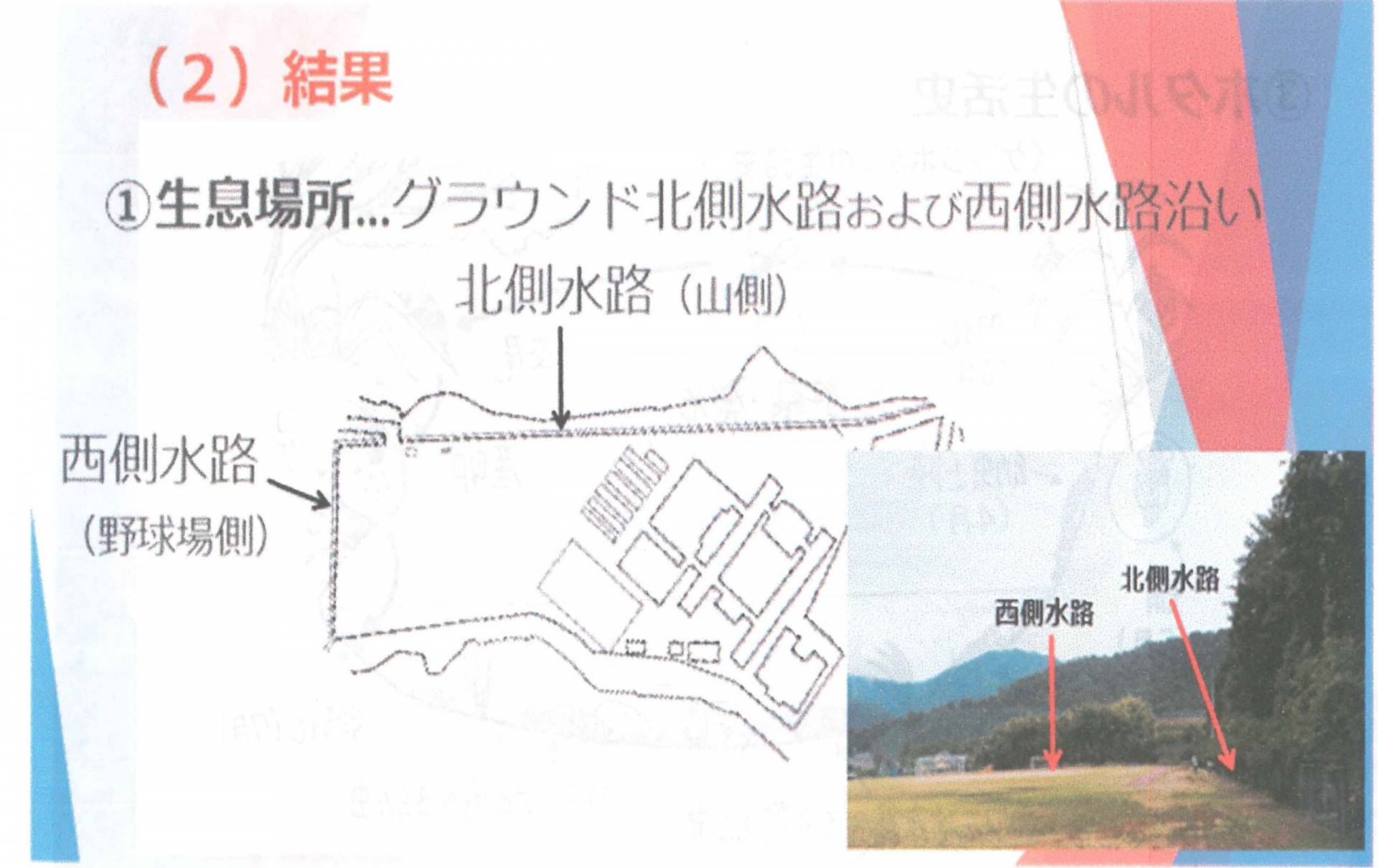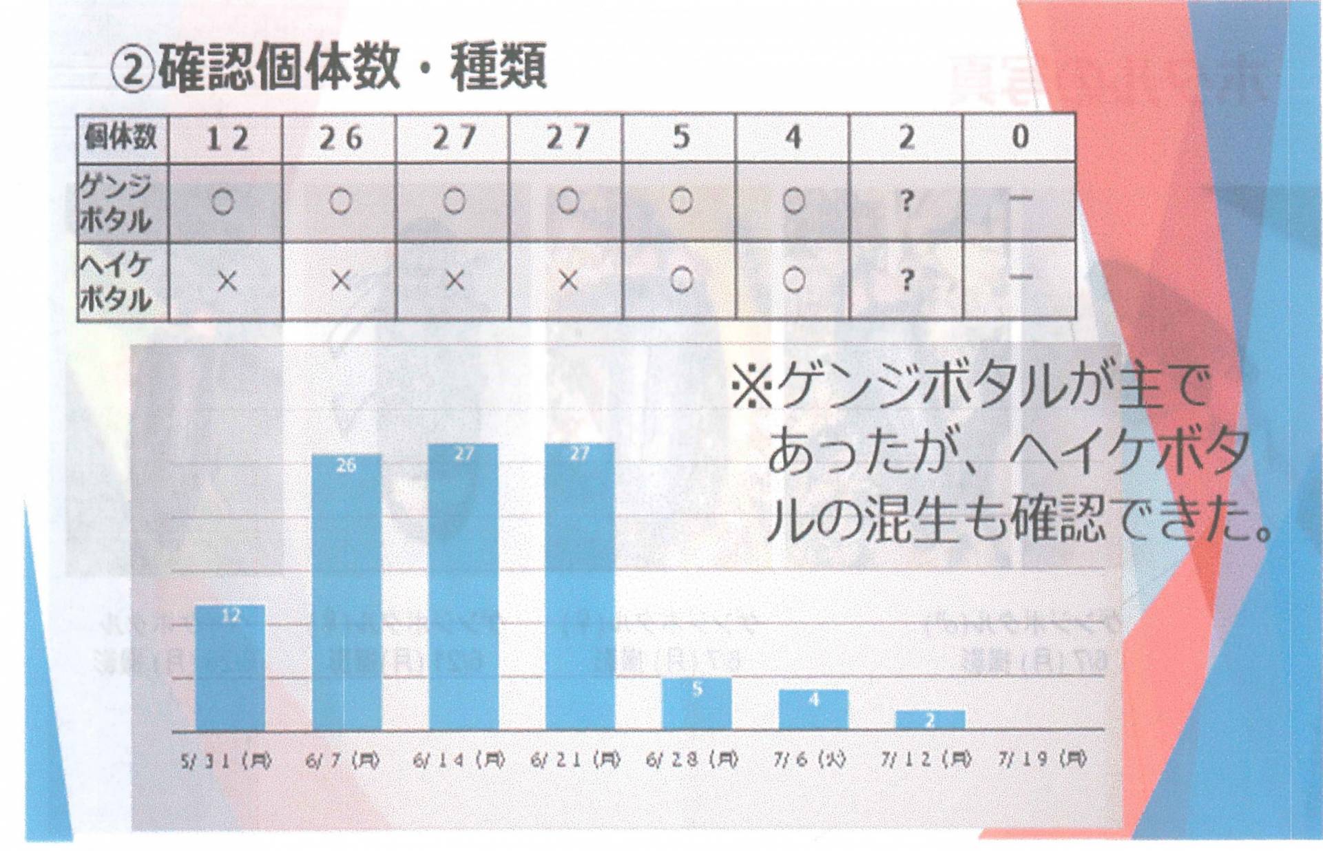 ・増加していたヘイケボタルは微減。特に北側に水路の両側に設けたブロック堰の影響により水流が変化し、水位が低下し、その付近でのへボタルの確認個体数が激減した。