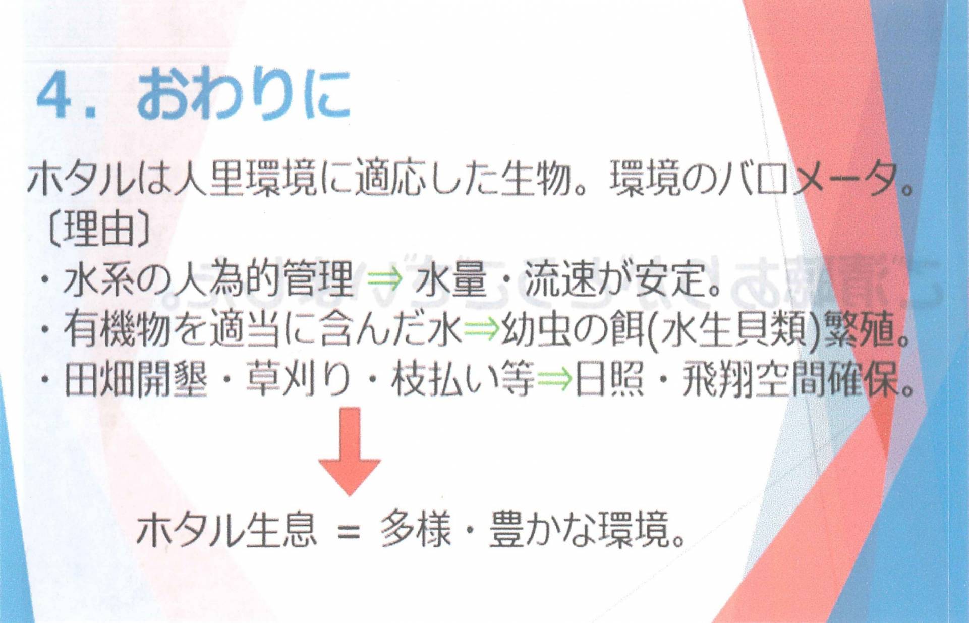 現時点では周辺地域の方との交流や市役所等行政との連帳はないが、本気で地域のホタル復活再生を考えるのならば、交流や連携が必要になるとは思う。