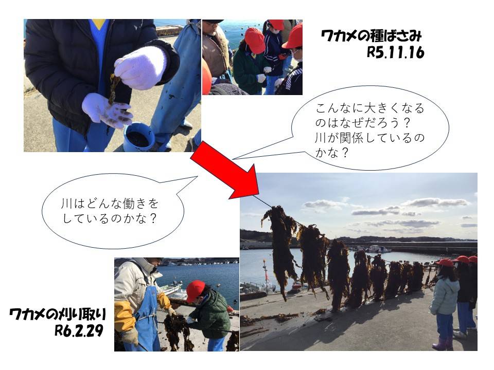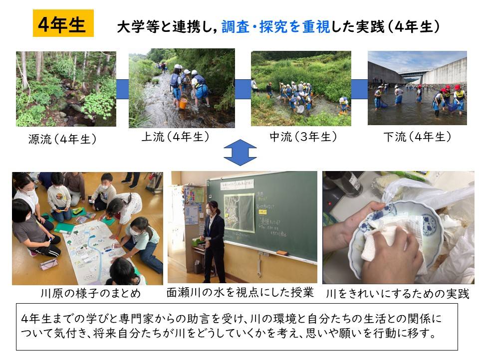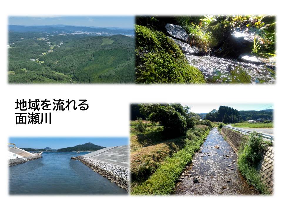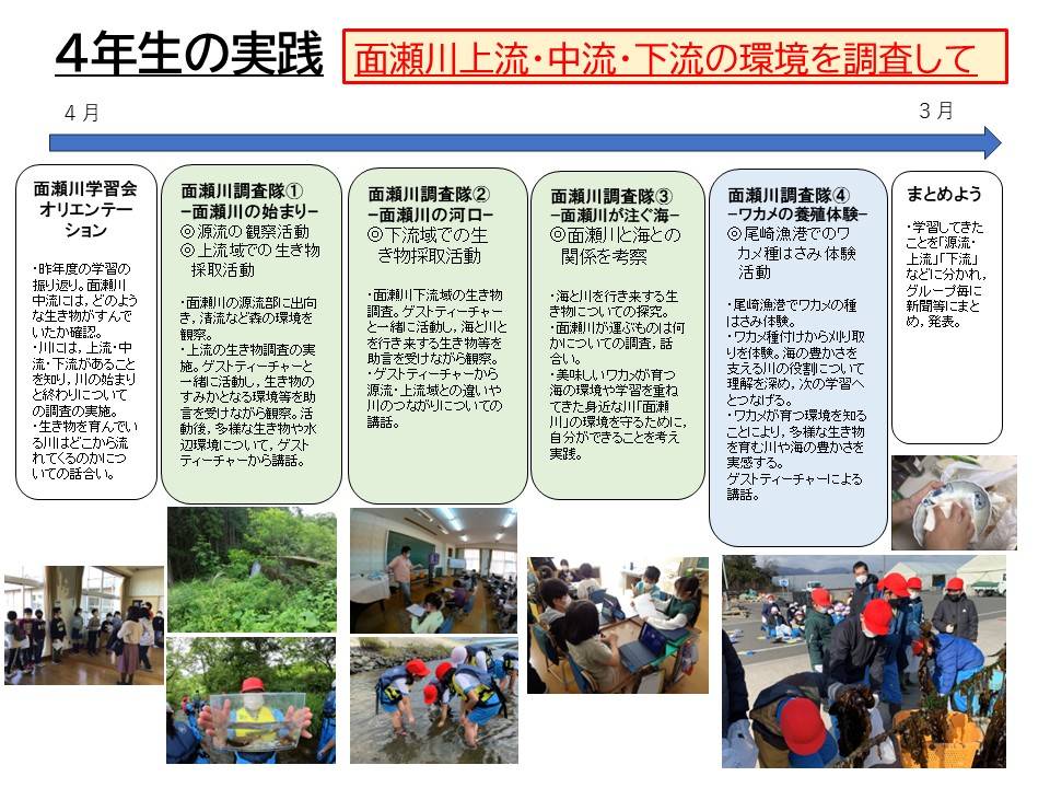 川の上流域から河口域までの各所の生き物や生息環境の特徴を比較したり、面瀬川と人々の生活の関わりについて調べたりする。この活動を通して、面瀬川の環境を知り、川の特徴や生活への影響について考えるとともに、水辺環境を守るために自分たちができることを考え、実践しようとする。また、「山・川・里・海」のつながりにも目を向け、河口近くの海で行われているワカメ養殖について調べたり体験したりする。