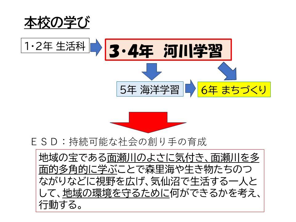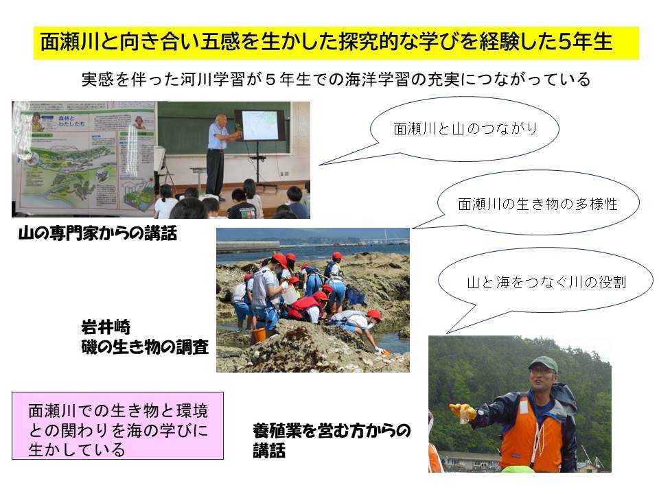 児童は、多くの水生生物が生息している面瀬川において、生き物を採取・観察し、水辺環境の課題解決に取り組んでいる。さらに、それらを基に「山と川のつながり」「川と海のつながり」など、河川学習から海洋学習へと発展させ、よりグローバルな視点での地域環境学習を展開している。