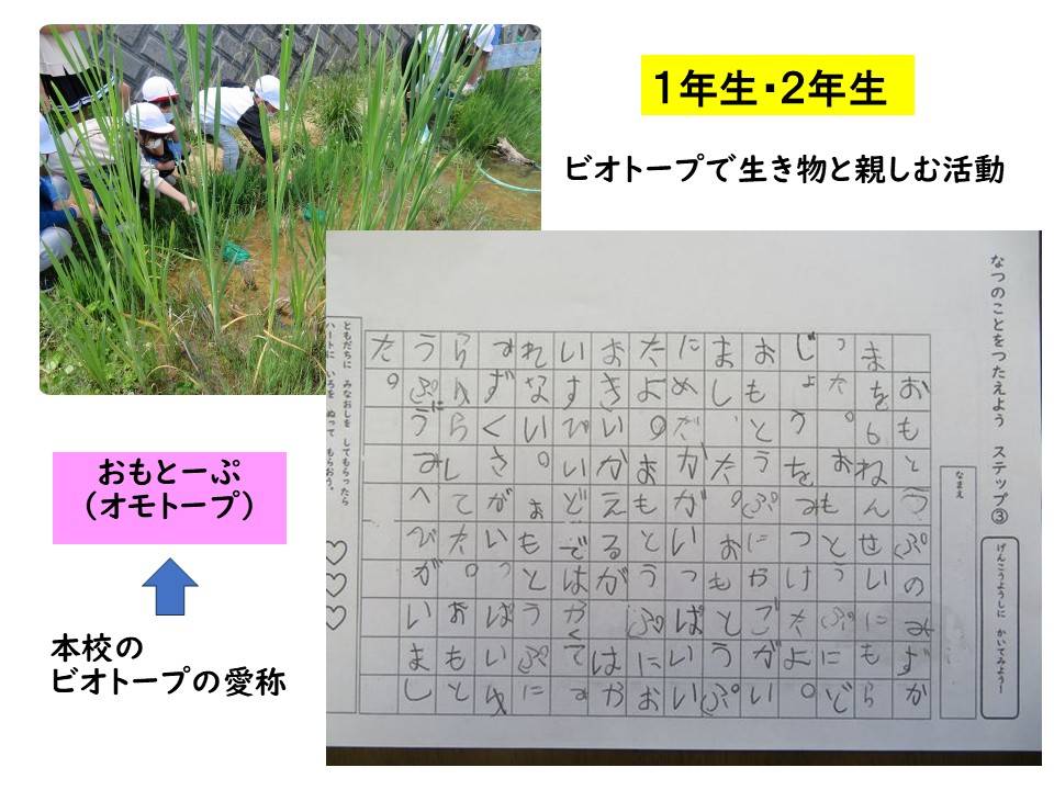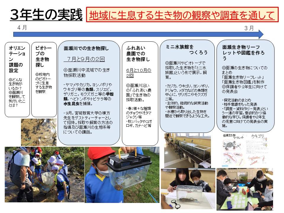 児童は、生き物を通して、地域の自然に深く関わる。ビオトープや面瀬川、地域の農園等で生き物を探したり捕まえたりして、それらを継続的に飼育・観察していく。この一連の活動を通して、多様な生き物の命と出会い、地域の自然の豊かさを感じ取るとともに、その自然環境を保全していこうとする意識を持つ。