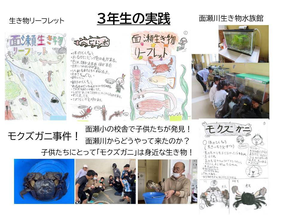 児童は、普段から目にしている面瀬川に、これほどまでに多様な種類の水生生物がいることに驚きを表し、感動を覚えていた。「こんなに魚がいるとは思わなかった!」「カニを捕まえて嬉しかった!」などという喜びの感情は、地域の豊かな自然環境が児童に与えてくれた贈り物である。採取した生物を継続的に飼育・観察することで生き物や環境に対する興味・関心を高めて「面瀬生き物リーフレット」を作成し、保護者や下級生など様々な人に生き生きと学びを発信した。主体的に活動する過程で、生き物や地域の自然環境に対する認識を深め、新たな気付きを得ることもできた。