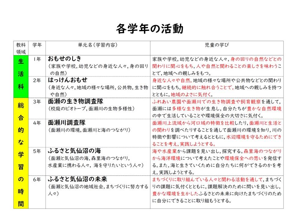 身近な面瀬川での探究的な学習を起点として、各学年において多様な生物の命と出会い、その命を育む地域の自然環境の豊かさを実感する本校の学びは、将来、野生生物保護活動や環境保全活動を担う人づくりにつながっていくものと考えている。