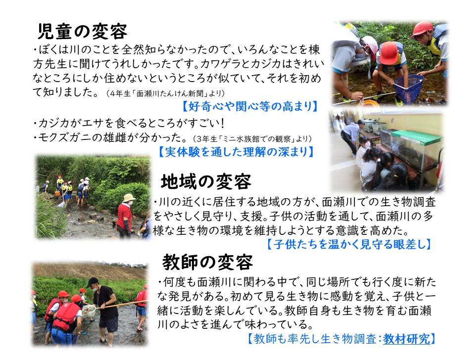 本校の児童は、様々な体験活動を通して、世の中には、自分の知らない生き物がまだたくさんいること、それぞれに命があること、そしてその命を育む環境が必要であることに気付いた。さらに、それらはつながっていることを知り豊かな自然を保全していく大切さを実感したことから、「台所から油を流さないようにする」「洗剤を使う量を減らす」「面瀬川付近のゴミを拾う」など、家庭を巻き込んだ様々なことに取り組み始めている。小さな一歩であるが、自分の意思を持って日々の生活を変革していく児童の姿は、今後の大きなうねりを生み出すきっかけになるものと考えている。