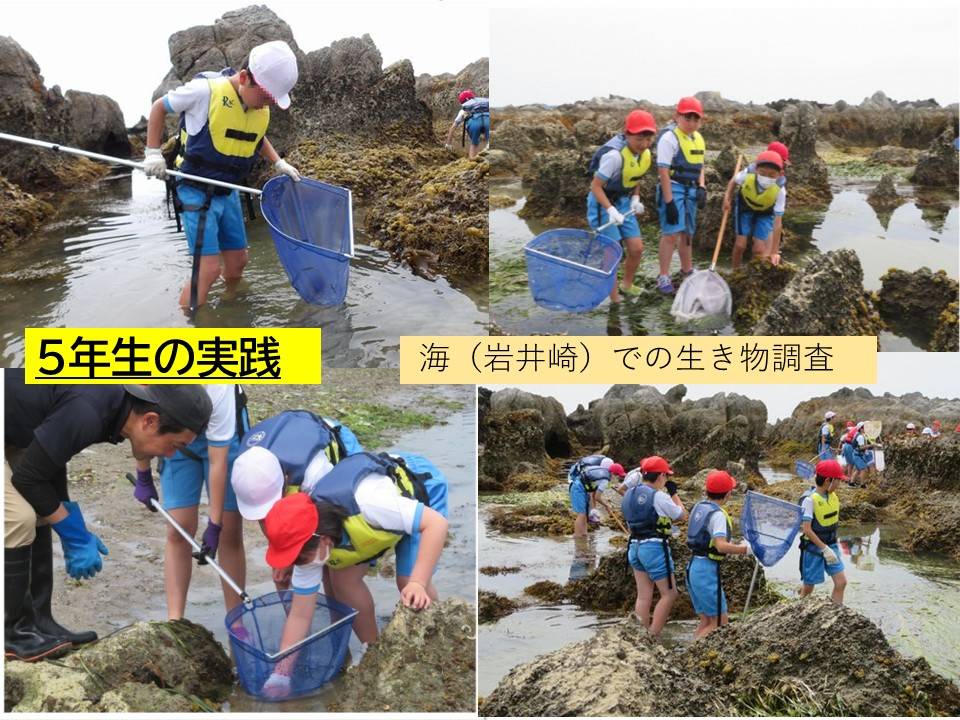 気仙沼の海や水産業の現状から課題を見い出し、探究する。海洋環境について考えたことや環境保全への自らの思いを発信し、海と共に生きていくために自分たちができることを考え実践しようとする。「磯の生き物調査」や「カキ養殖場見学」等の体験学習や個々に課題を設定しての探究的な学習に、児童は主体的に取り組む。さらに、竹富町立波照間小・中学校とオンライン交流を行い、環境の違いを実感するとともに、波照間島で取り組んでいる環境保全活動について活動の様子やその思いを同年代の仲間から聞くことで、自分も取り組んでいこうとする意欲を高める。