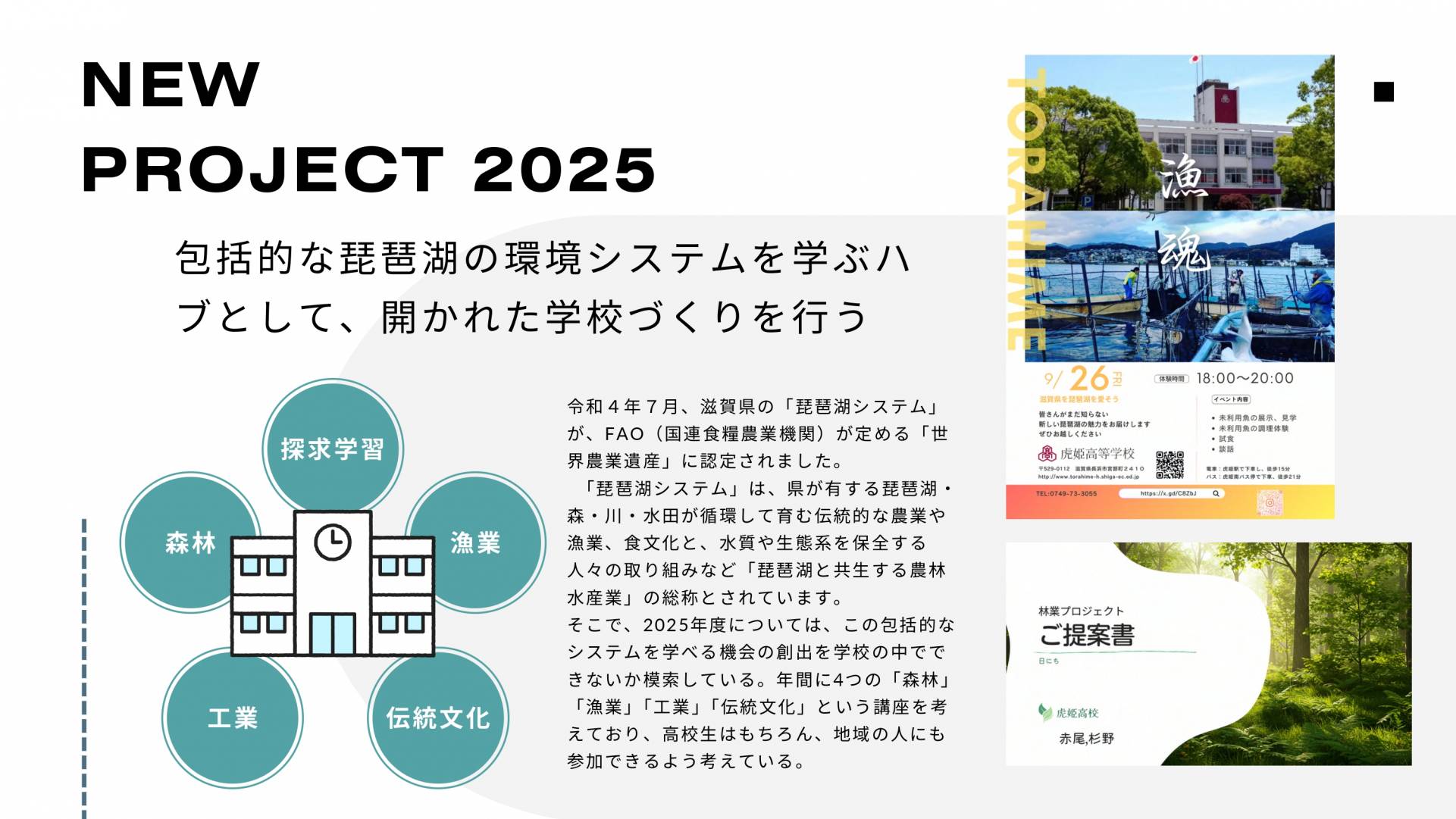2025年度には「琵琶湖システム」の世界農業遺産に認定されたことをきっかけに、ヨシだけでなく包括的な琵琶湖を取り巻く環境を同時に学ぶ重要性に気づきました。そこで、今のヨシの探究活動に加え、漁業・森林・工業・伝統文化の4つの分野のスペシャリストと手を組み、放課後の学校を解放した「夜の学校」という講義と、「体験型アクティビティ」の2本立て講座を計4分野学ぶ「滋賀のわプロジェクト」を推し進めている。