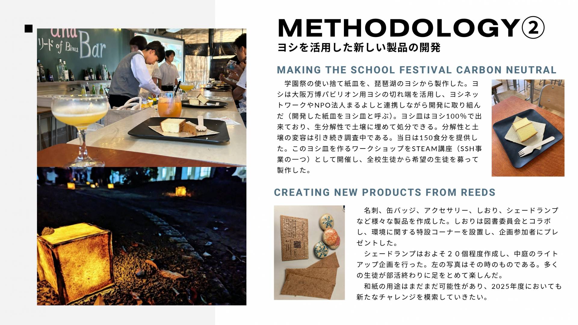 実際に琵琶湖の現地を訪れてヨシを植え、地域で保全活動を行うNPO法人の方々から直接お話を伺うことで、教科書だけでは得られないリアルで実践的な知識を学び取りました。現場の声を大切にしながら探究を進めた点が、本活動の大きな強みです。滋賀県近江八幡市には、重要文化的景観に認定されたヨシ群落があり、そこでのヨシ刈りも実際に体験しました。1年間を通して、ヨシ群落の循環に包括的に取り組めたことは、活動の大きな成果の一つです。