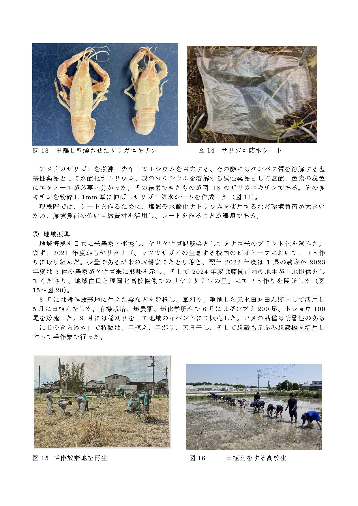 (2)アメリカザリガニの定期的な駆除及び効果的な駆除方法の研究、アメリカザリガニは冬季に幼体を駆除することにより翌年に生息数が減少することを確認した。また、アメリカザリガニからキチンを取り出し、防水フィルム作成に成功した。