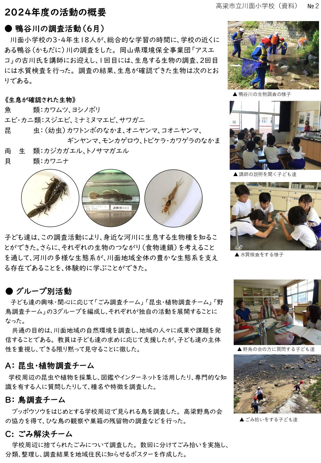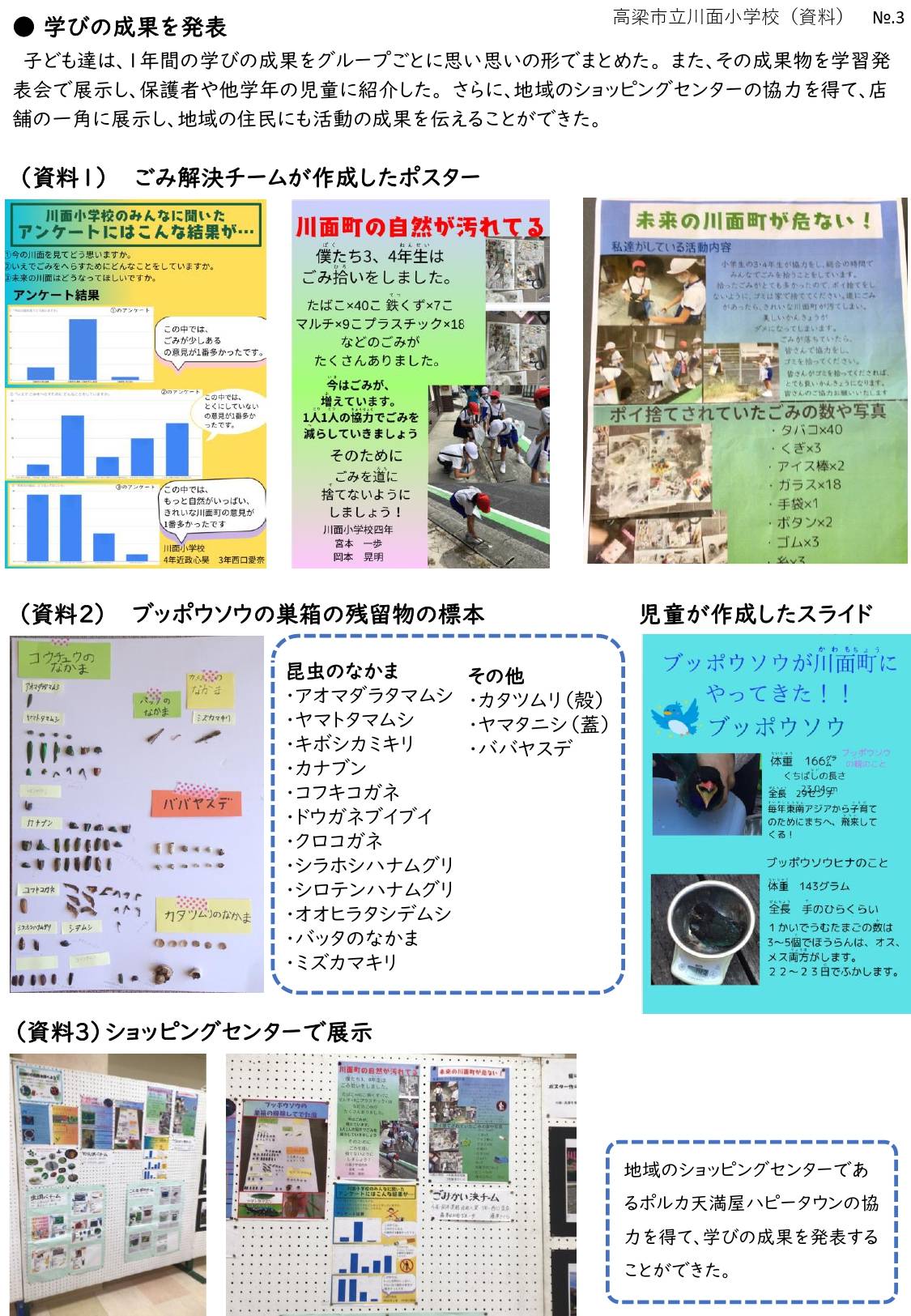 近隣の中学校・高校、高梁野鳥の会、地域住民との交流により、子ども達が新たな視点で物事を見つめ、多様な気付きができることを心がけている。また、子ども達が学びの成果を地域住民へ向けて発信し、フィードバックを得ることは子ども達の新たな気付きや意欲の原動力になっている。