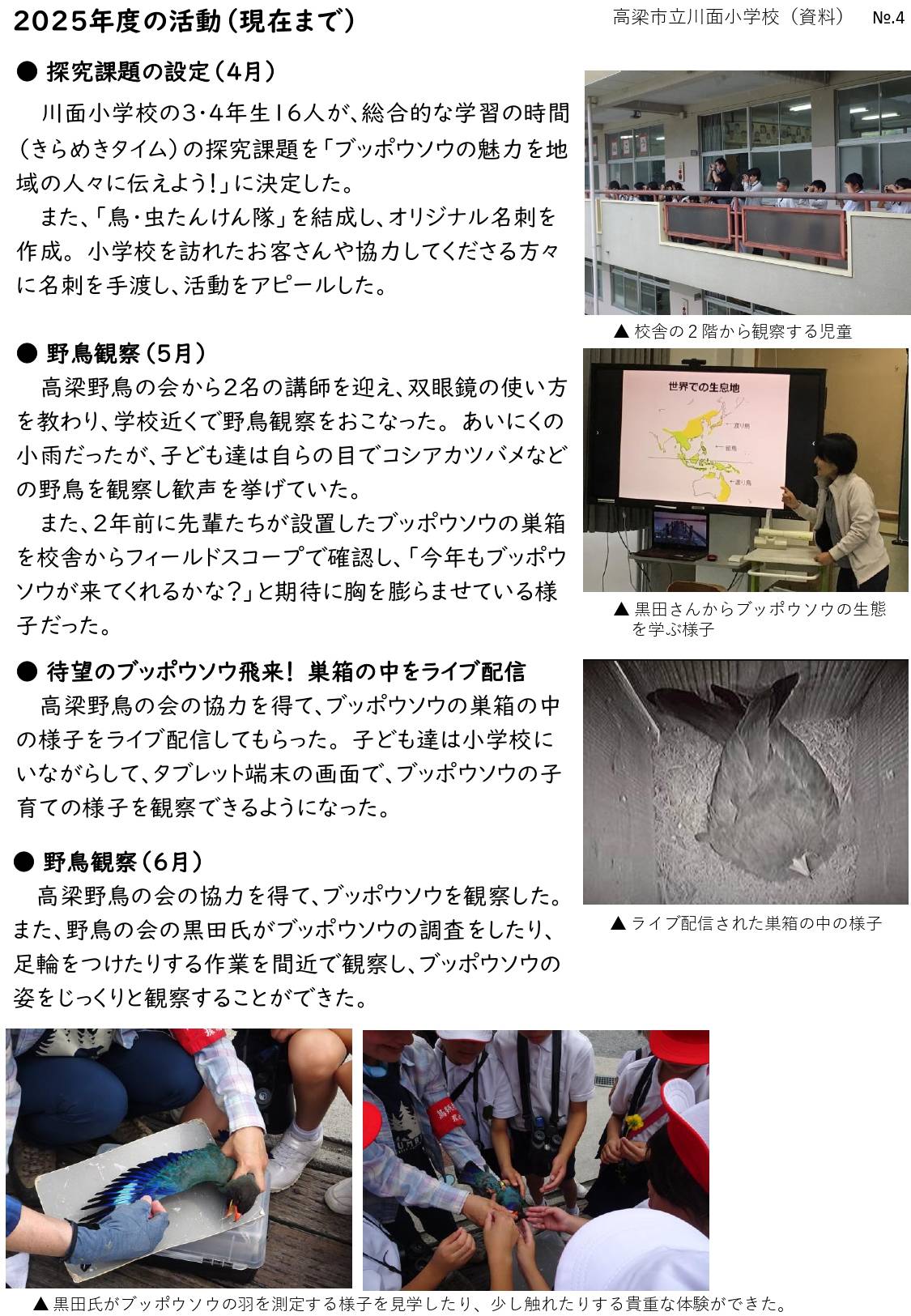 2023年(令和5年)から、高梁野鳥の会の協力をいただき、主に3・4年生がブッポウソウの保護活動に継続的に取り組んできた。初年度には、子ども達がブッポウソウの飛来を願って巣箱を製作し、思い思いのデザインを施して学校周辺の2個所に設置した。