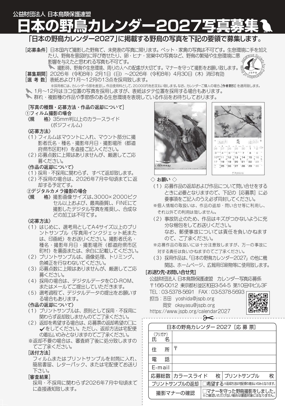 (3)採用作品は、「日本の野鳥カレンダー2027」の他に機関誌、ホームページ、広報用印刷物等に使用致します。