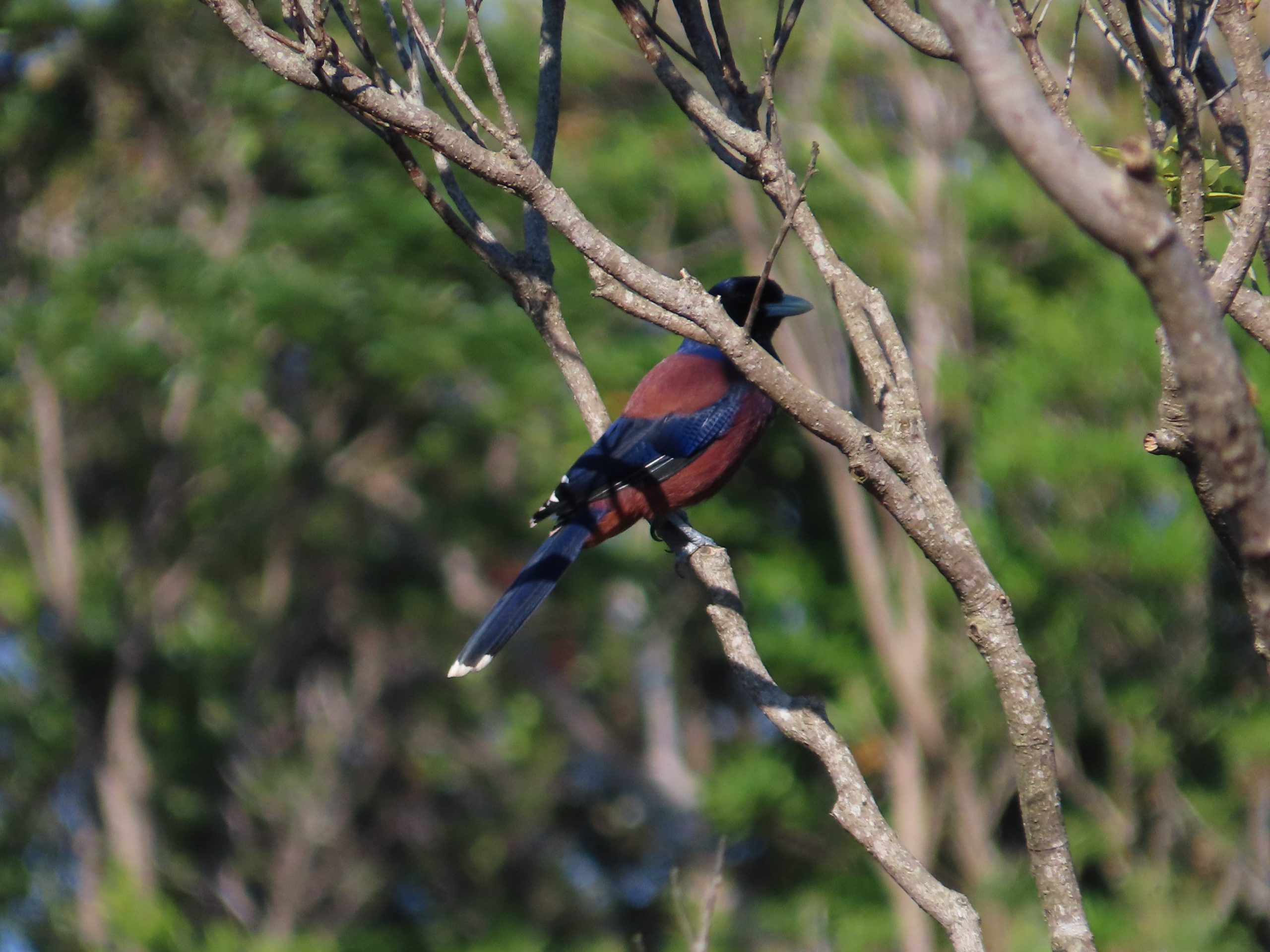 9月の奄美大島はまだまだ残暑が厳しく、短パンとTシャツでふつうに過ごすことができます。それでも夜明けの空気が少しだけひんやりしてきて、どことなく秋の気配を感じるようになってくる月の中旬、晴れた朝は弾む心を携えていそいそと高台にのぼります。明るくなった森の樹冠部では、ルリカケス(写真1)が鳴きながら飛び回ったり、ズアカアオバトが間の抜けた声で鳴いていたり。