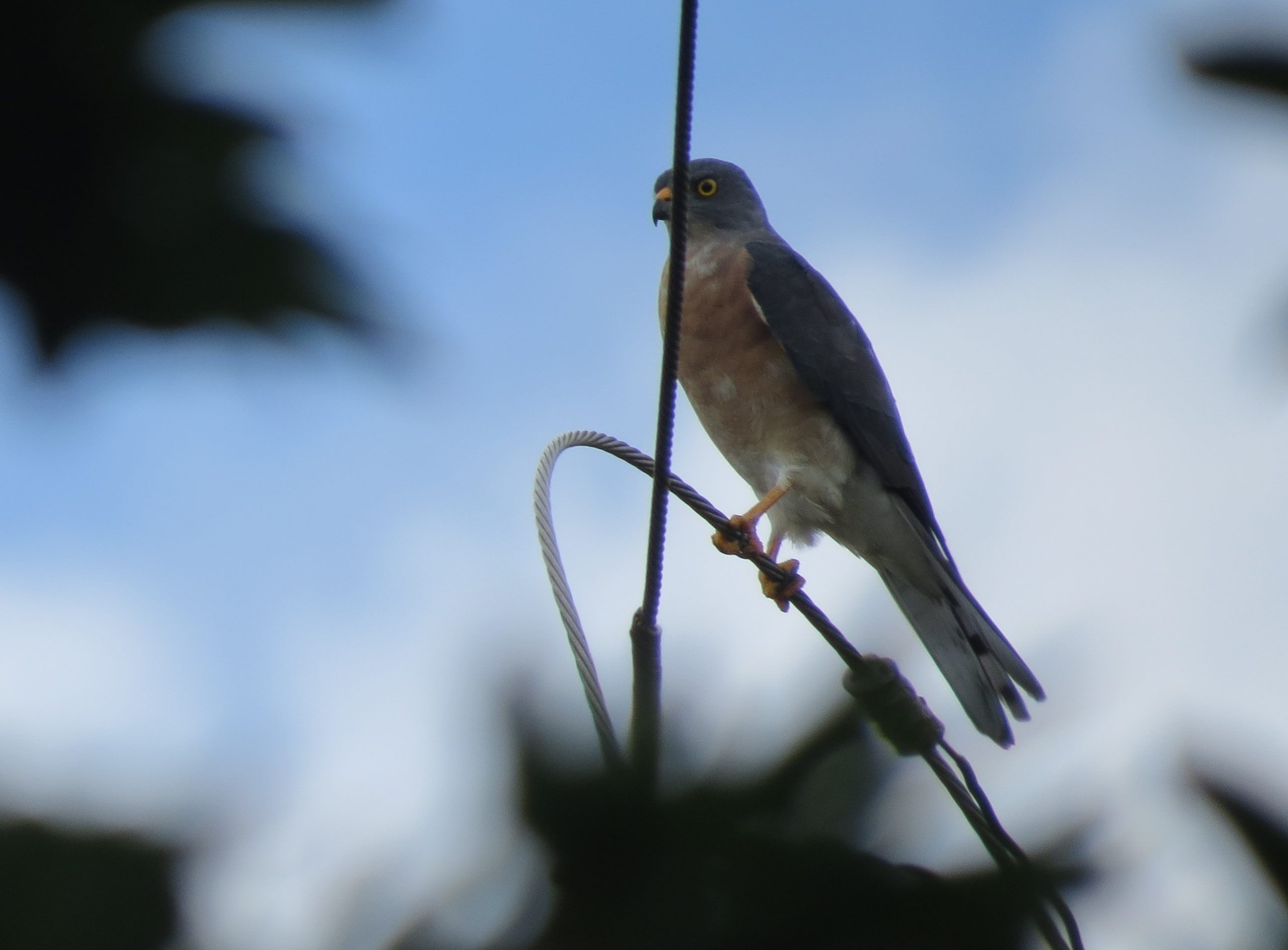 太陽が姿を現してしばらくすると、山裾から霧が空に向かって立ちのぼっていきます。大気が暖められ、上昇気流が発生しているのです。と、その気流に乗って、旋回しながら空にのぼっていく1羽のハトくらいの大きさの鳥が。お目当てのアカハラダカです(写真2)。双眼鏡で姿を追っていくと、いつのまにか他のアカハラダカが上空で数羽、大きな輪を描いているではないですか。ふと、近くの電柱に目を転じると、別のアカハラダカが1羽、すぐにも飛び立ちたそうにうずうずしています。その名の通り腹部がほんのり赤く染まったオスの個体です。やがてこのオスも飛び立ち、上空で待機している仲間たちと合流しました。観察地点の高台周辺では、アカハラダカは20羽ほどの小群となって飛んでいきました。