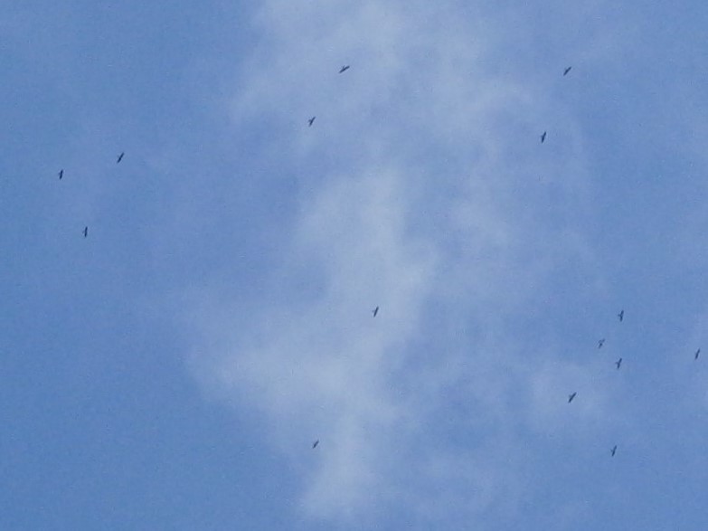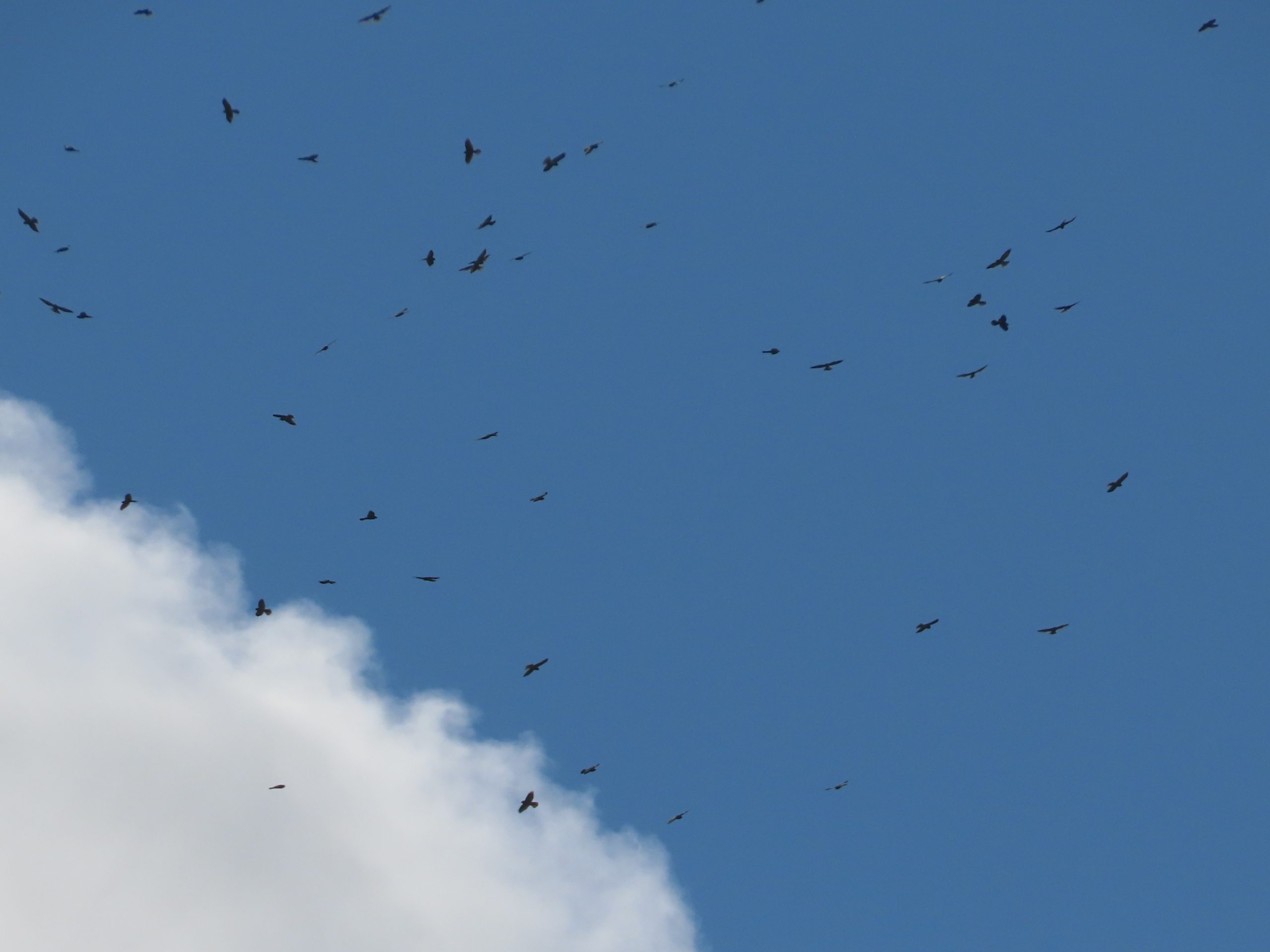 一緒に観察をしていたメンバーが上空を指差して叫びました。すぐに目を転じましたが、肉眼ではなにもとらえることができません。しかし、双眼鏡を当てて、びっくり! おびただしい数のアカハラダカが塊になって空に浮いていたのです(写真3)。その数、およそ800羽。蚊柱ならぬ鷹柱、いや、鷹団子と呼んだほうが適切でしょうか。しばらく観察していると、鷹の団子はさらに数を増し、大集団で南方向へ流れていきました(写真4)。