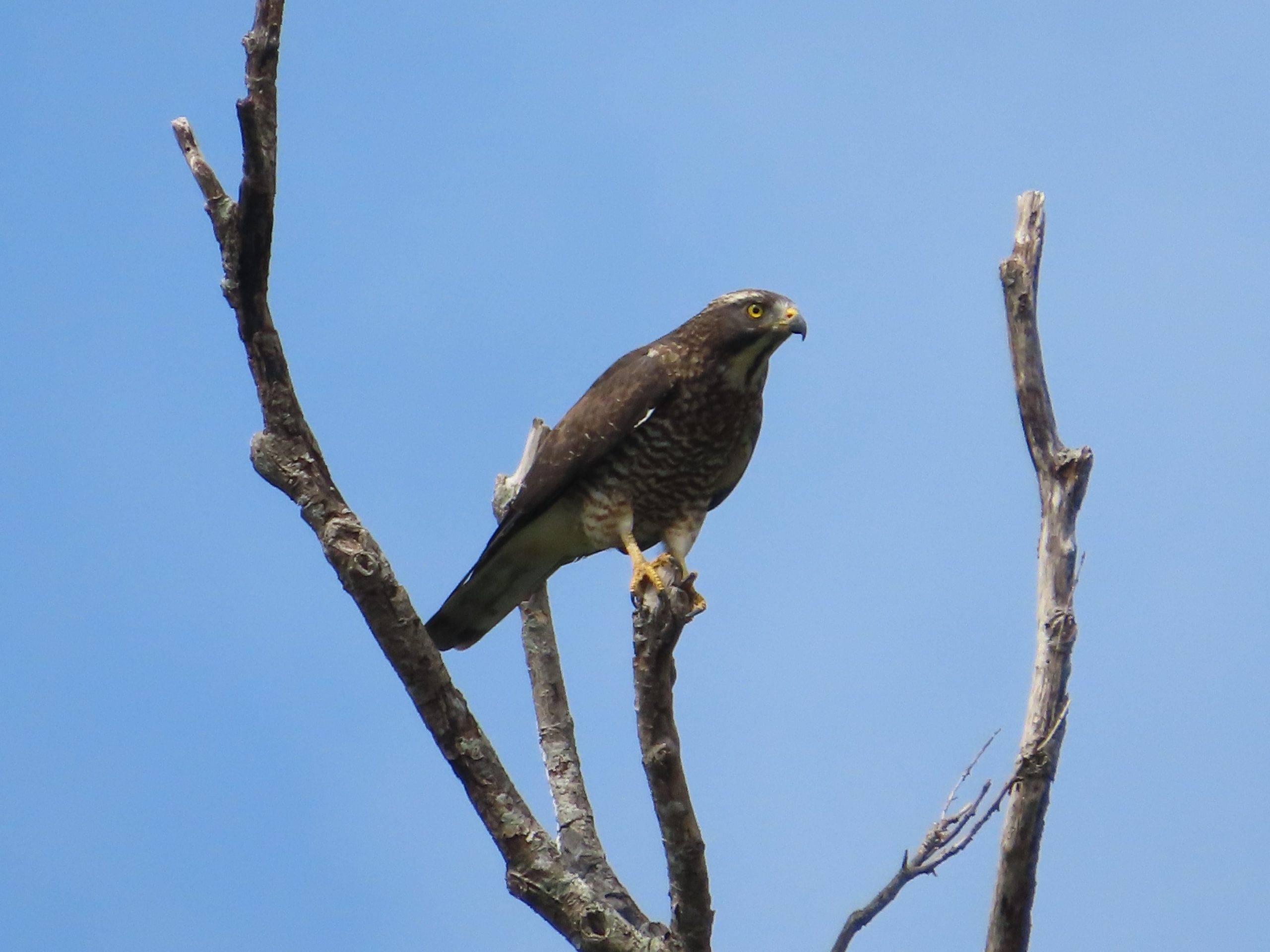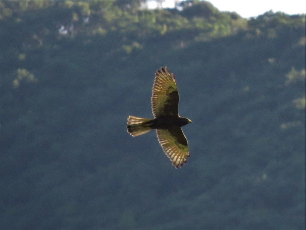 10月の朝、島の南部で待っていると、さらに南へ向かうサシバを観察することができます。とある集落の港に寝転がって空を眺めていると、次から次にサシバが飛んでいきます。飛び立ったばかりなので高度が低く、1羽1羽の模様がはっきり見えるのが実に楽しい。縦斑が目立つ幼鳥が飛んだかと思えば、胸がしっかり焦げ茶色のベテランもいます。運がよければ、暗色型のサシバに出会うことがあります(写真6)。木に止まっているときは全身が焦げ茶色に見えますが、翼を広げると風切羽が白いことがよくわかります。