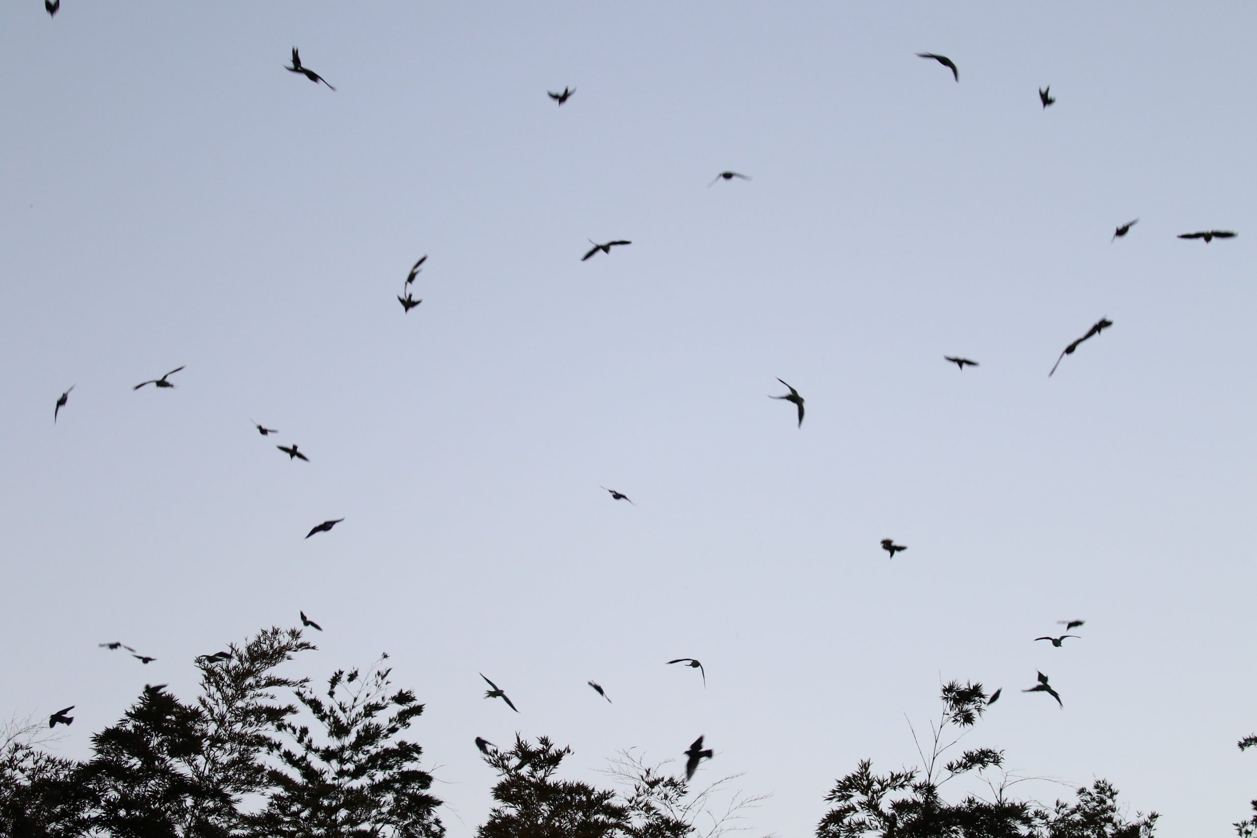 ムクドリ、スズメ、ハクセキレイは、しばしば駅前の街路樹などの人通りの多いところで群れでねぐらを作ります。明るく騒がしい場所では眠りづらいように思えますが、そういった場所を選ぶことで地上にいる大抵の捕食者を遠ざけることができます。しかし近年ではオオタカやハヤブサが都市に進出し人通りの多い場所にあるねぐらでも襲われるといった事例が出てきています。こういった都市に進出してきた猛禽類は人通りが多くてもさほど気にしないようで、目をつけたねぐらには毎日のように襲撃にきます。そのうちにねぐらが消滅したり移動したりすることもあるようで、自然界ではそのような攻防が日々繰り返されています。