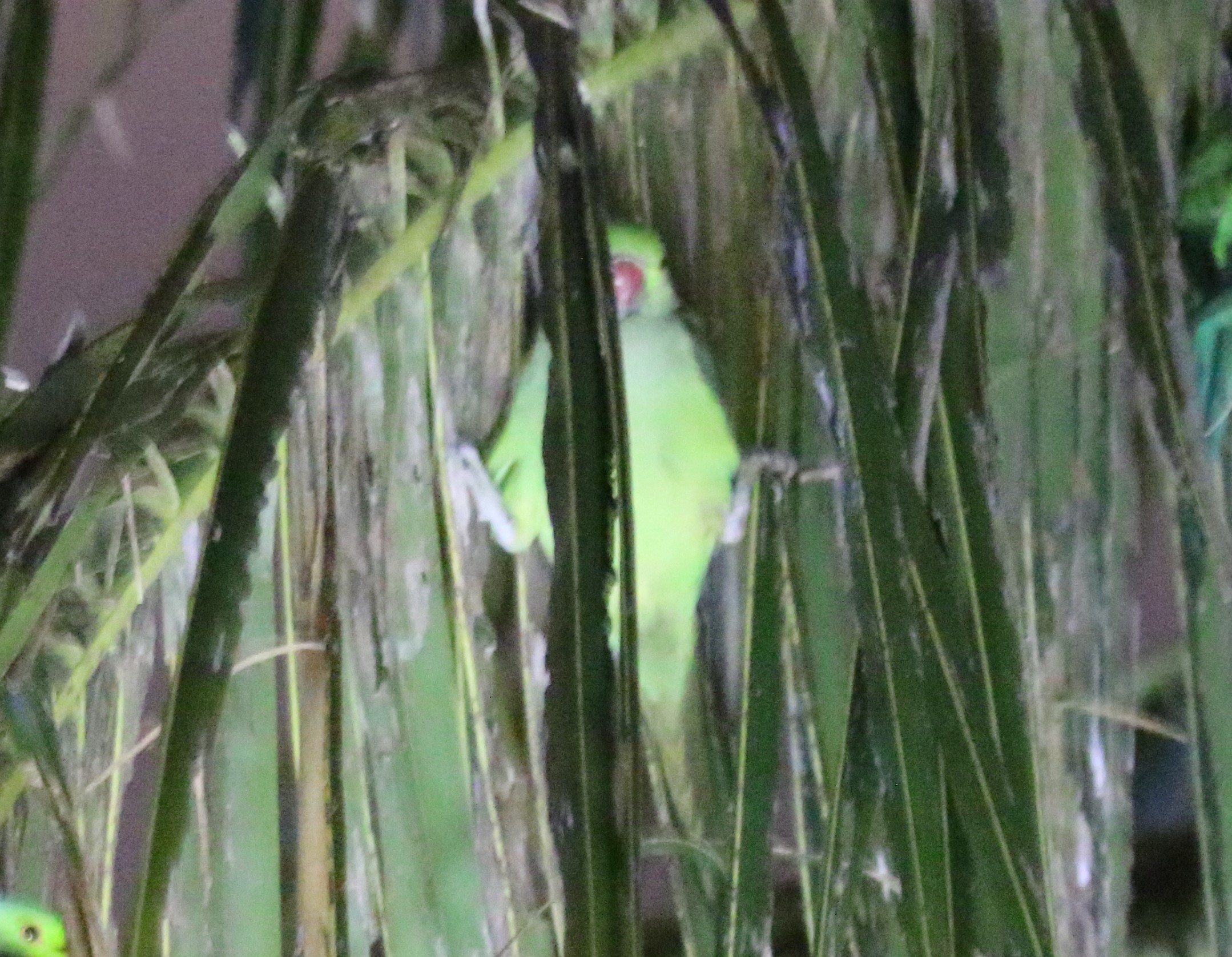 スリランカを訪れた際にワカケホンセイインコのねぐらを案内してもらったのですが、その全てがヤシの木でした。ヤシの木の利点は竹藪と共通する点があります。ヤシの木も枝が無く哺乳類やヘビにとっては登りづらいでしょうし、外敵が樹冠にある葉っぱの方までくれば揺れるのでやはり気づきやすいのでしょう。面白いのがその眠り方で、みんな一様に葉っぱの下に入って両脚を広げて葉っぱを掴みながら寝ていました(写真3)。他にこんな眠り方をしている鳥を見たことがありませんが、日頃からぶら下がったりしながら採餌するワカケホンセイインコにとってはこの様な格好でも辛くないのかもしれません。ヤシの木の葉の下で眠るのは下からは丸見えですが、見えることで逆に下からの捕食者が登ってくることにはやく気づくことができますし、上からの捕食者である猛禽類からは隠れることができ急な襲撃を防げるので好都合なのでしょう。