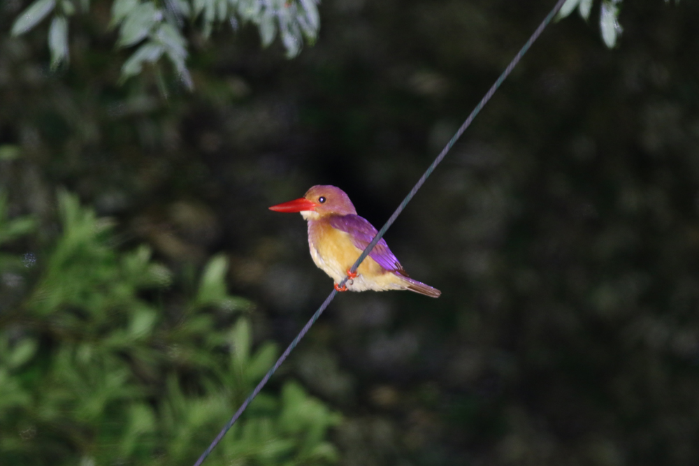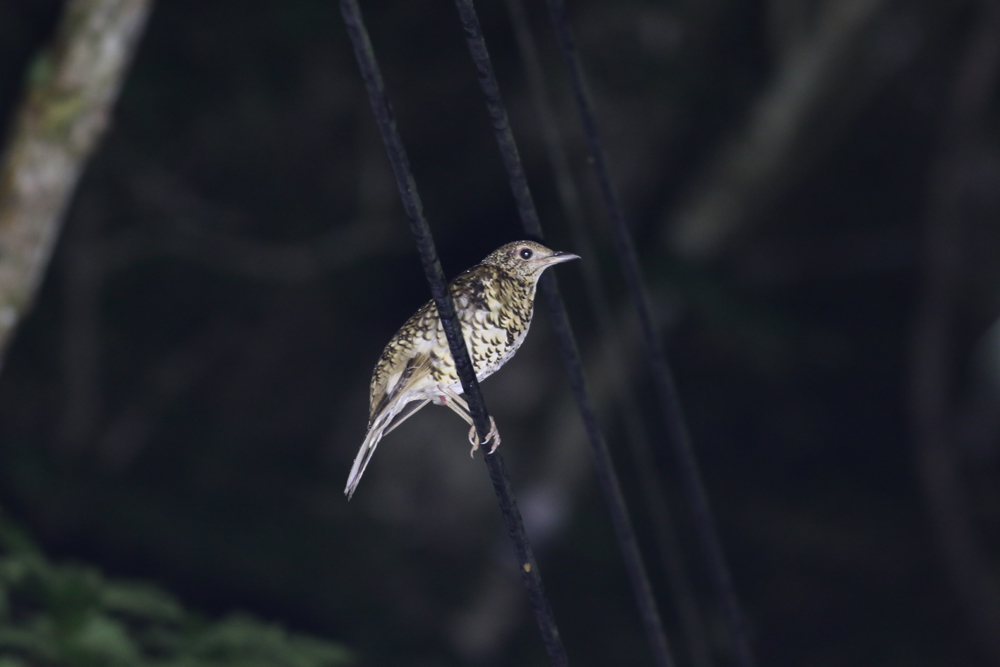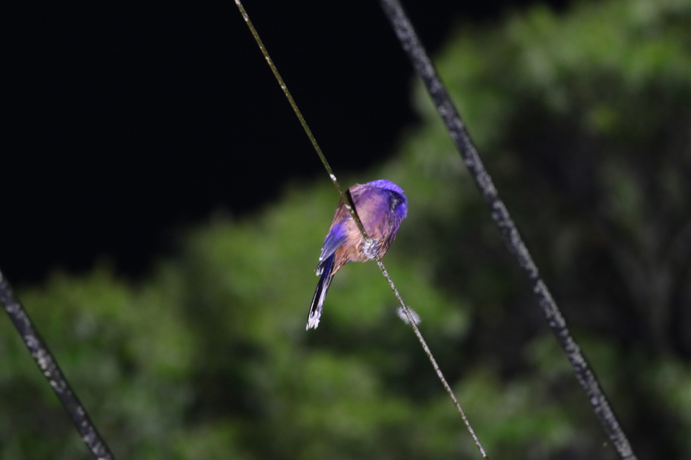 以前奄美大島で夜間の動物観察に出かけた際、道路わきの木から道路上に張り出した枝先に2羽で眠っているズアカアオバトに出会いました(写真1)。ズアカアオバトにとって最大の天敵はハブになりますが、ズアカアオバトは枝先で眠ることでたとえハブが近づいてきたとしても枝の揺れで気づき、飛んで逃げることができます。近年ではノネコが野鳥を襲い問題になっていますが、道路に張り出した枝先であればノネコも接近できないでしょう。ルリカケス、オオトラツグミ、アカショウビン、キジバトでは、枝先以外にも電線で眠っている個体もいました(写真4-6)。奄美大島では鳥を襲うような大型のフクロウがいないので、上からの攻撃を気にする必要がなく、電線や枝先といった周りからよく見える場所でも眠ることができるようです。